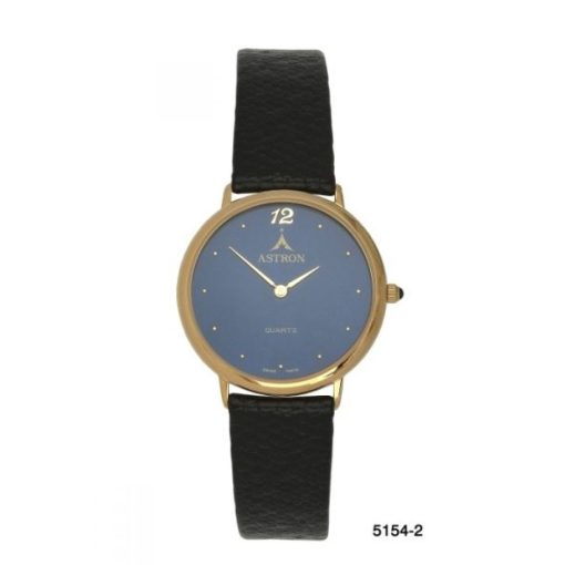 ASTRON 5154-2 unisex karóra, arany színű fém tok, fekete bőrszíj, kék számlap, keményített ásványüveg, quartz szerkezet, cseppmentes vízállóság