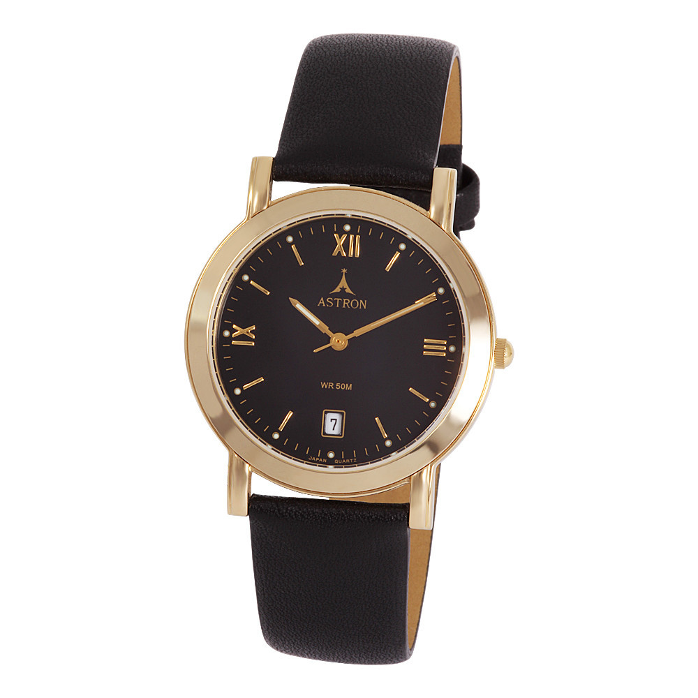 ASTRON 5168-1 férfi karóra, arany színű nemesacél tok, fekete bőrszíj, fekete számlap, keményített ásványüveg, quartz szerkezet, cseppmentes vízállóság
