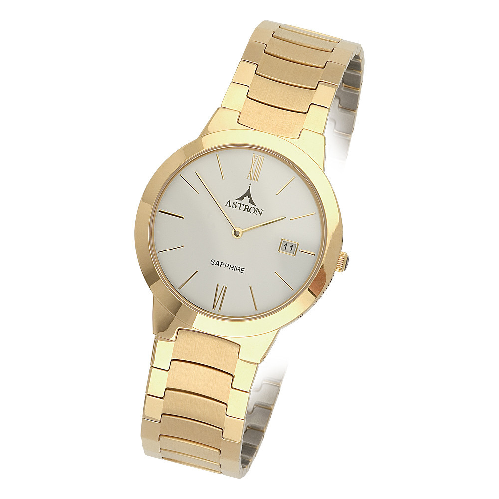 ASTRON 5275-7 férfi karóra, arany színű nemesacél tok, arany színű nemesacél csat, római számos fehér számlap, zafírüveg, quartz szerkezet, cseppmentes vízállóság