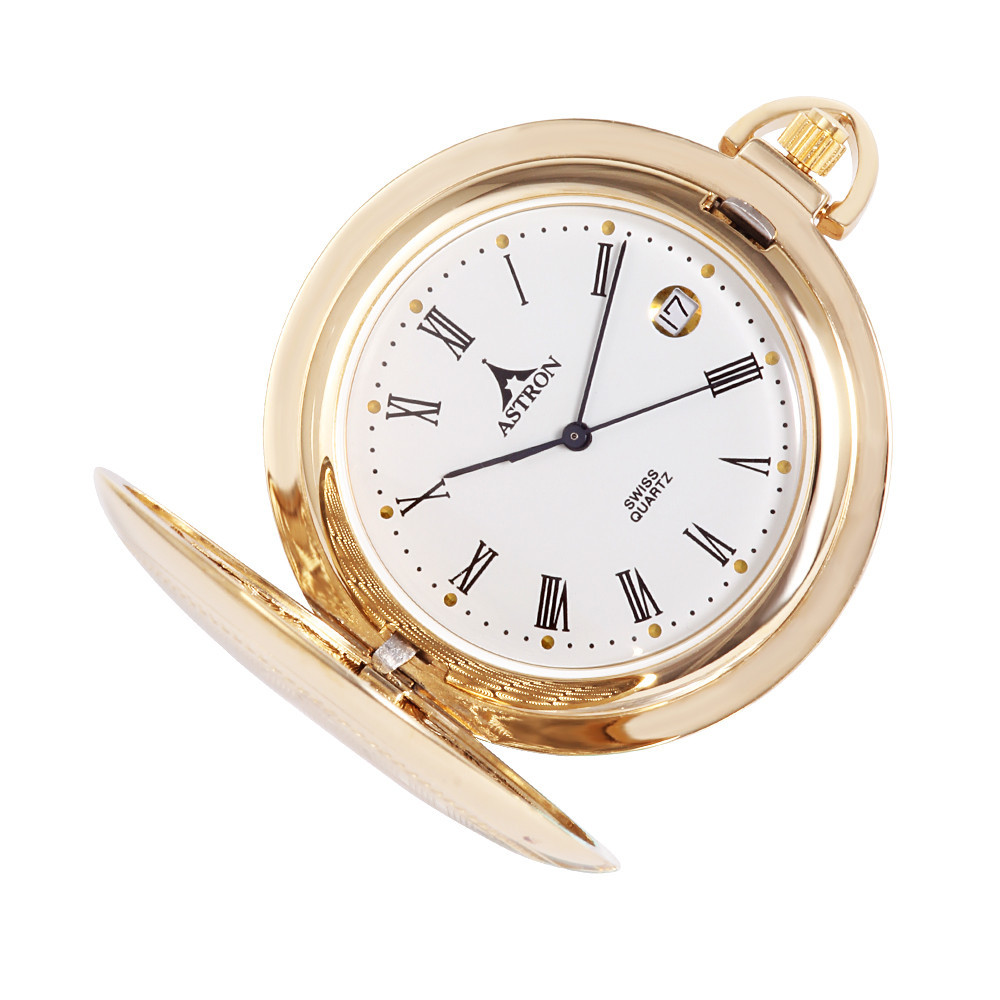 Astron zsebóra, arany színű tok és lánc, fehér számlap, római számok
