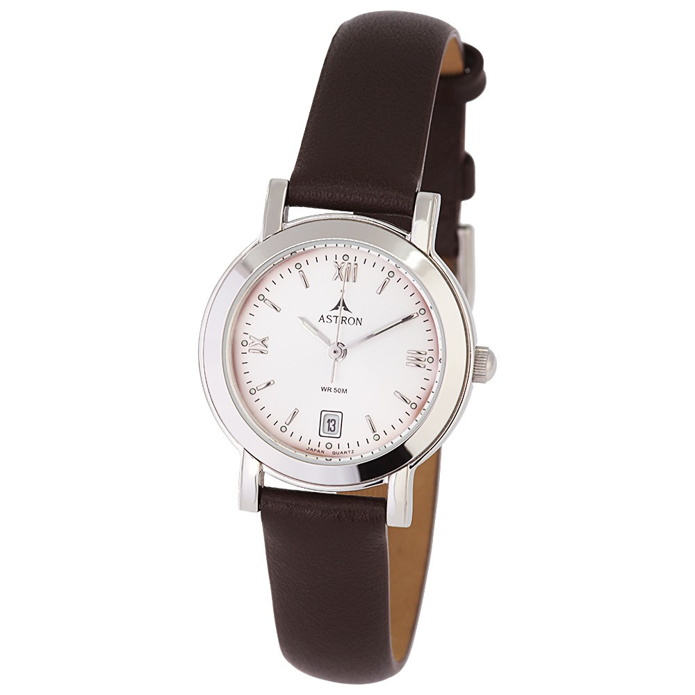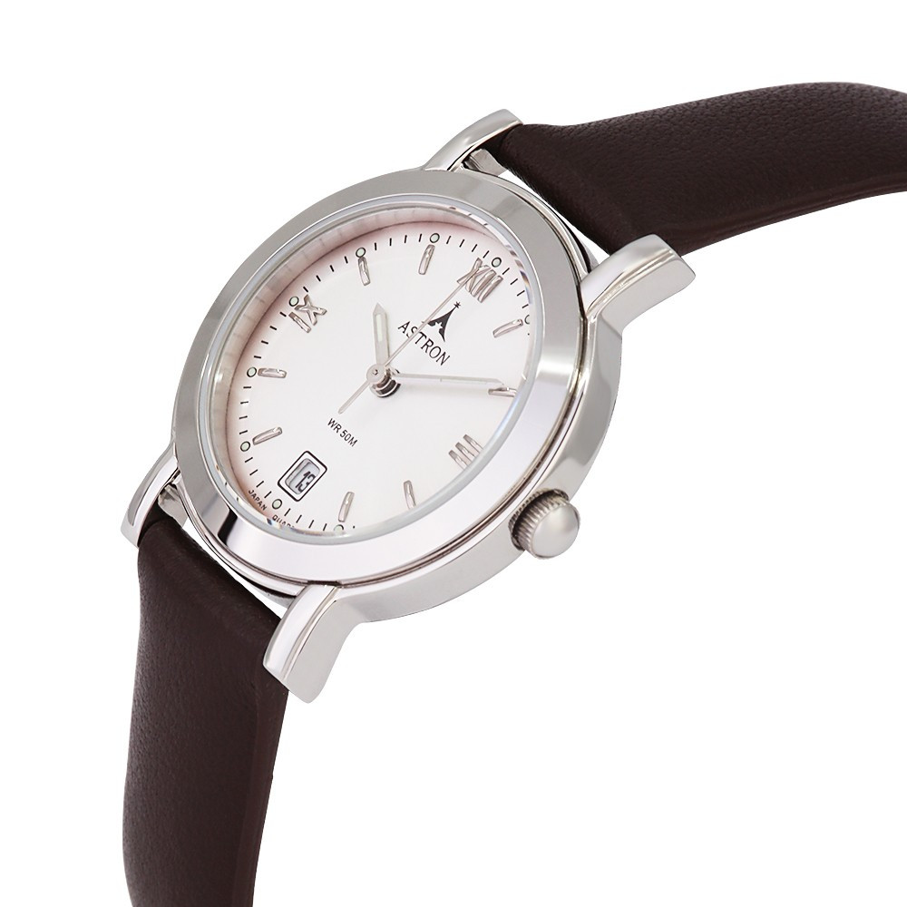 ASTRON 5407-8 divatos női karóra, ezüst színű nemesacél tok, barna bőrszíj, római számos, ezüst színű számlap, keményített ásványüveg, quartz szerkezet, 50 m (5 ATM) vízállóság
