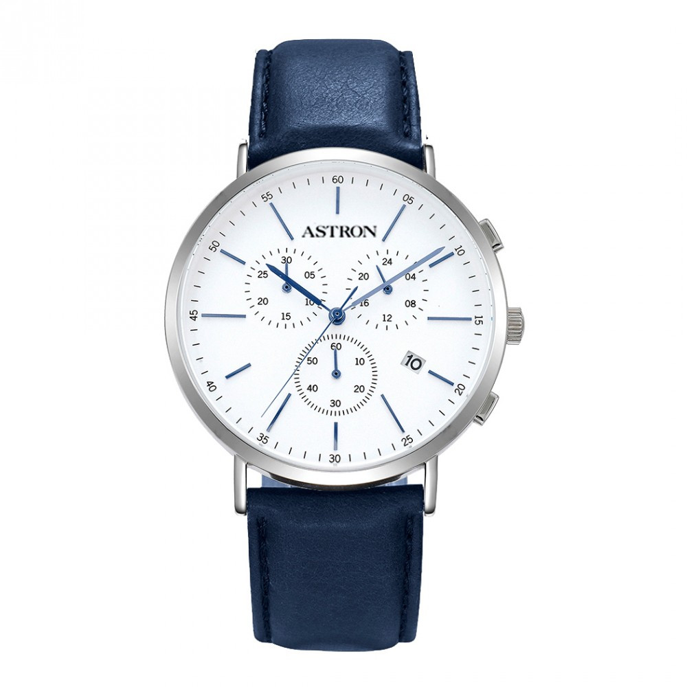 ASTRON 5504-7 férfi karóra, chronograph, ezüst színű nemesacél tok, kék bőrszíj, fehér számlap, keményített ásványüveg, quartz szerkezet, cseppmentes vízállóság