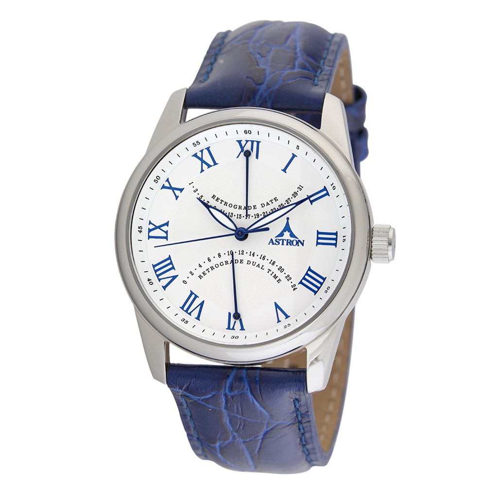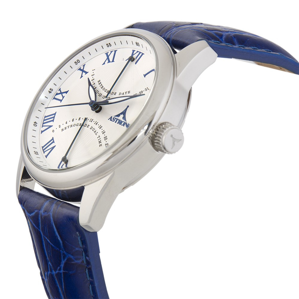 ASTRON 5507-7 férfi karóra, multifunkciós, ezüst színű nemesacél tok, kék bőrszíj, fehér számlap, keményített ásványüveg, multifunkciós quartz szerkezet, 50 m (5 ATM) vízállóság