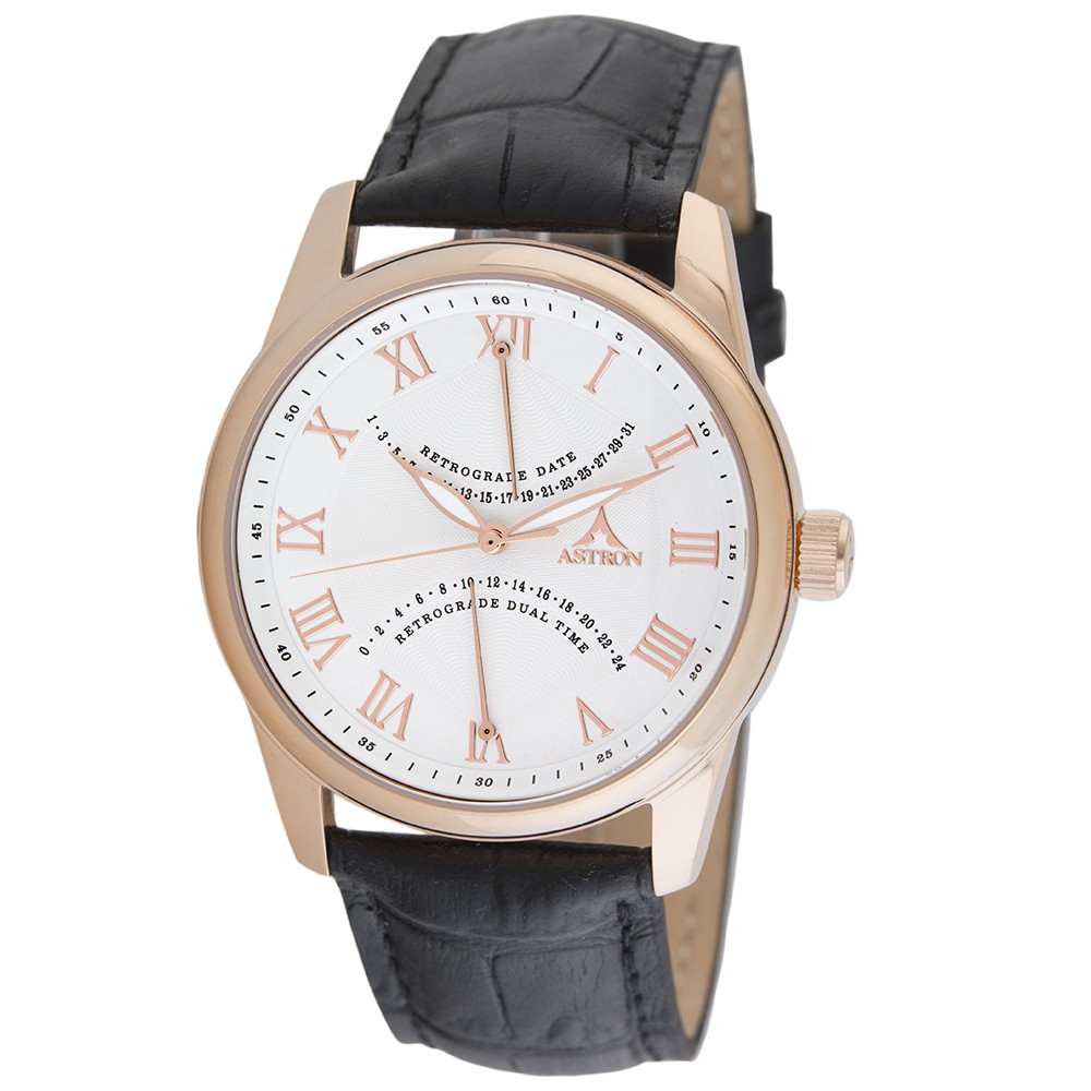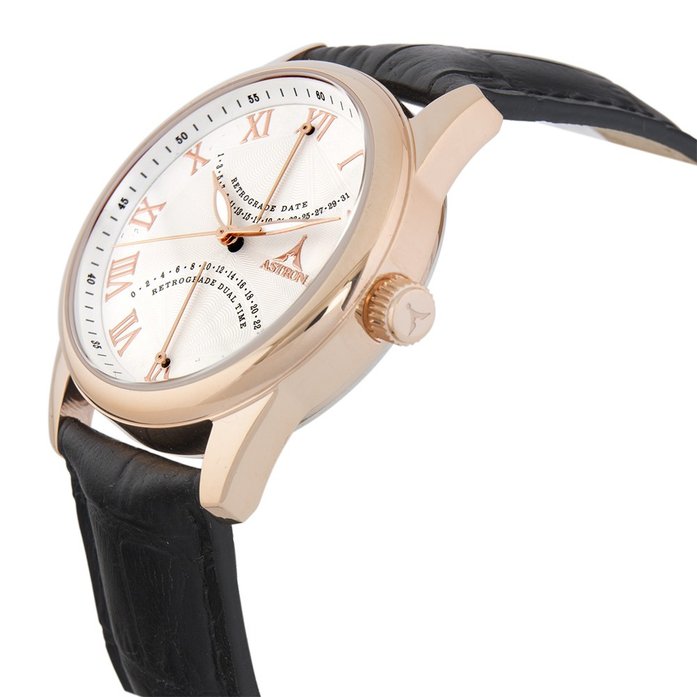 ASTRON 5507-8 férfi karóra, multifunkciós, rózsaarany színű nemesacél tok, fekete bőrszíj, fehér számlap, keményített ásványüveg, quartz szerkezet, 50 m (5 ATM) vízállóság