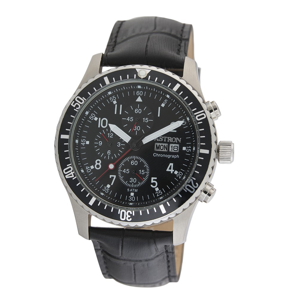 ASTRON 5508-0 férfi karóra, ezüst színű nemesacél tok, fekete bőrszíj, fekete számlap, keményített ásványüveg, chronograph quartz szerkezet, 50 m (5 ATM) vízállóság