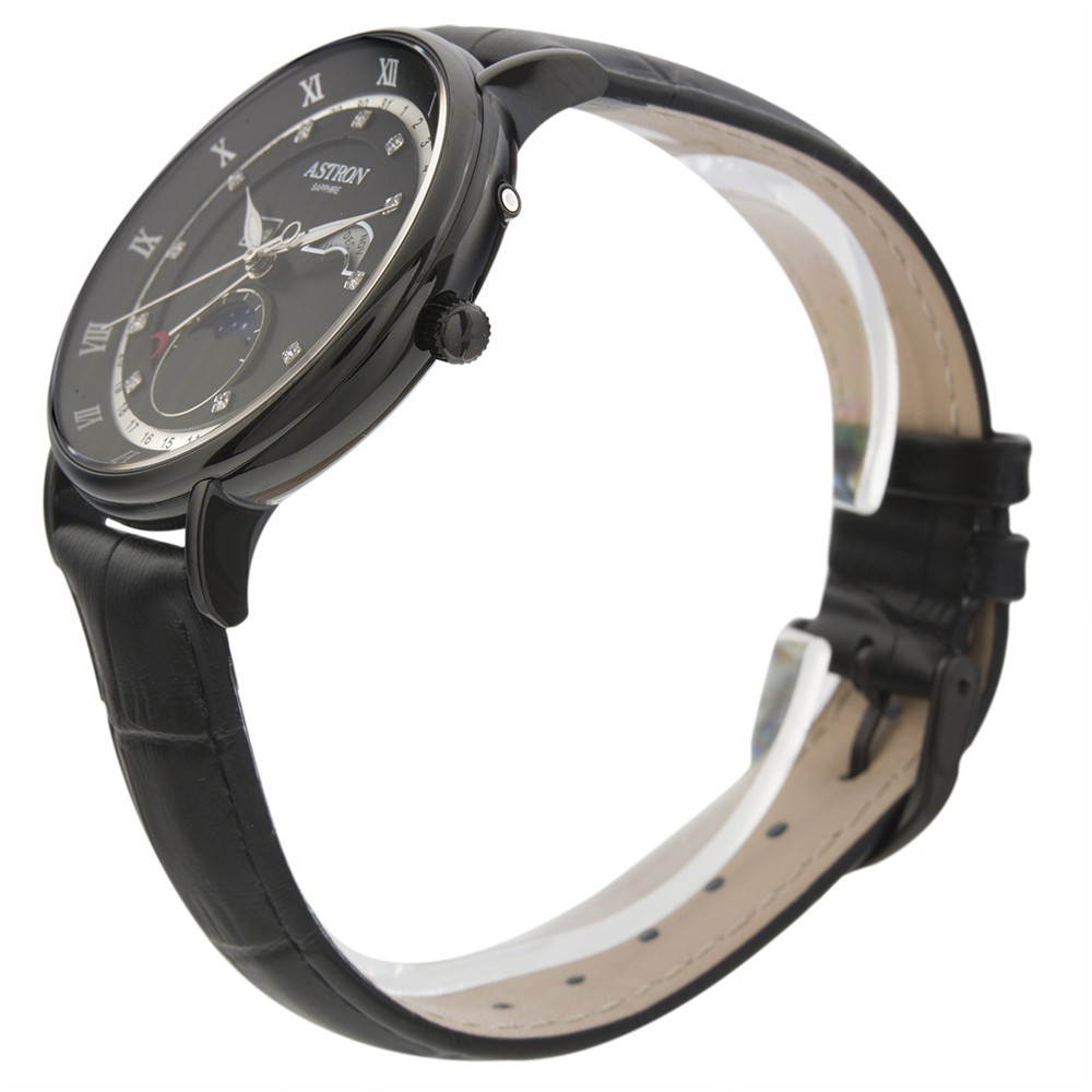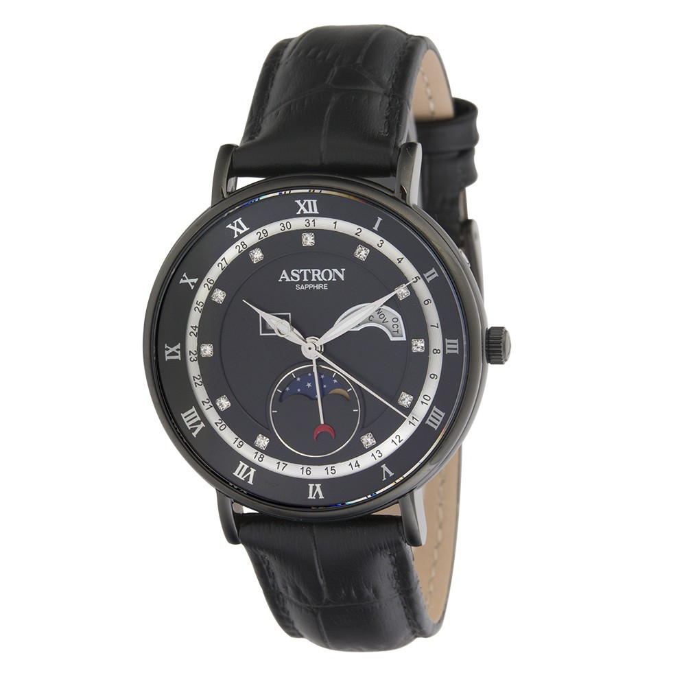 ASTRON 5509-1 férfi karóra, multifunkciós, fekete színű nemesacél tok, fekete bőrszíj, fekete számlap, zafír, quartz szerkezet, cseppmentes vízállóság