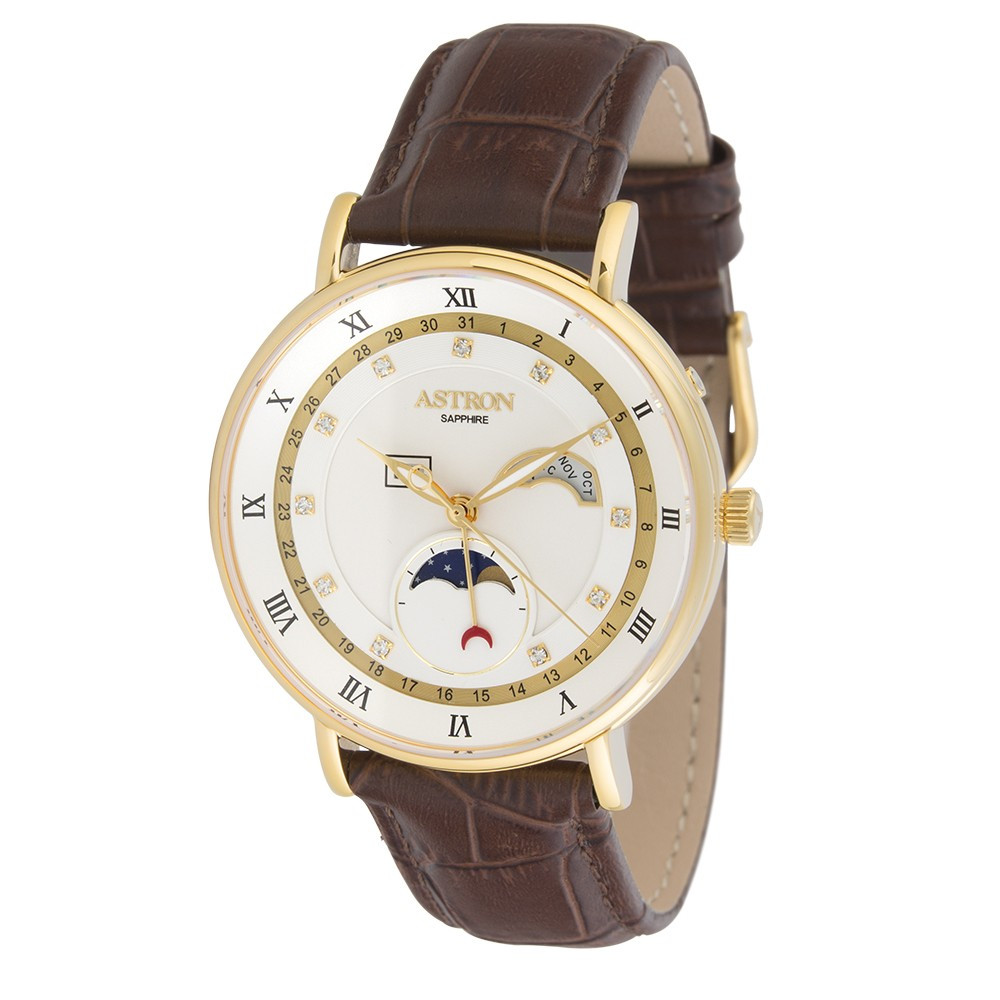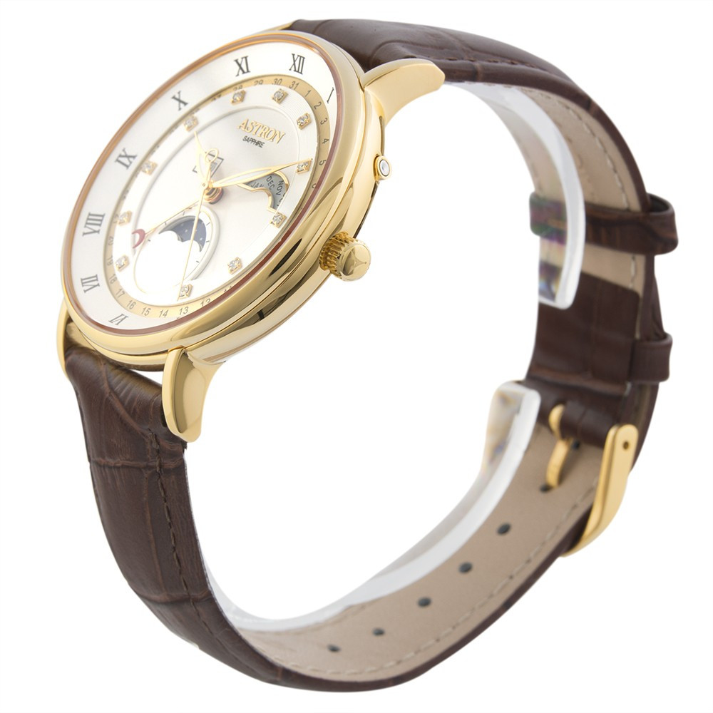 ASTRON 5509-8 férfi karóra, multifunkciós, arany színű nemesacél tok, barna bőrszíj, fehér számlap, zafír, quartz szerkezet, cseppmentes vízállóság