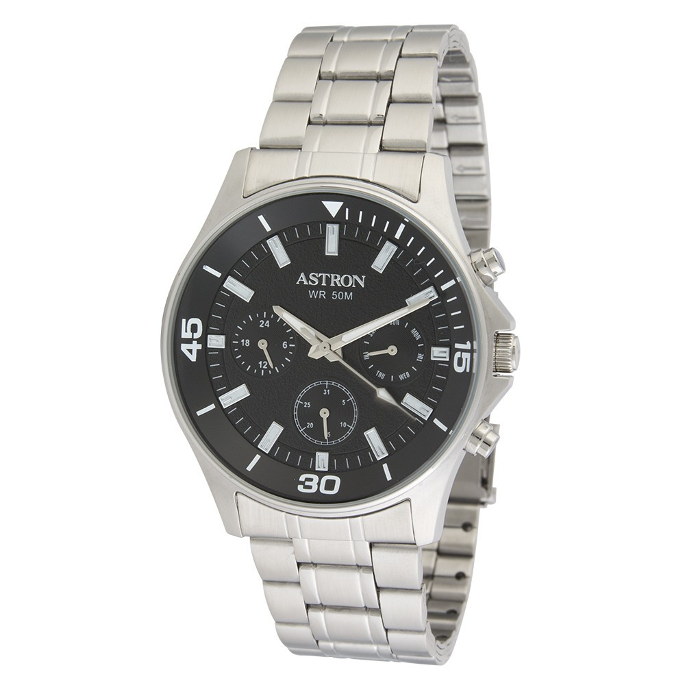 ASTRON 5510-1 sportos férfi karóra, ezüst színű nemesacél tok, ezüst színű nemesacél csat, fekete számlap, keményített ásványüveg, multifunkciós quartz szerkezet, 50 m (5 ATM) vízállóság