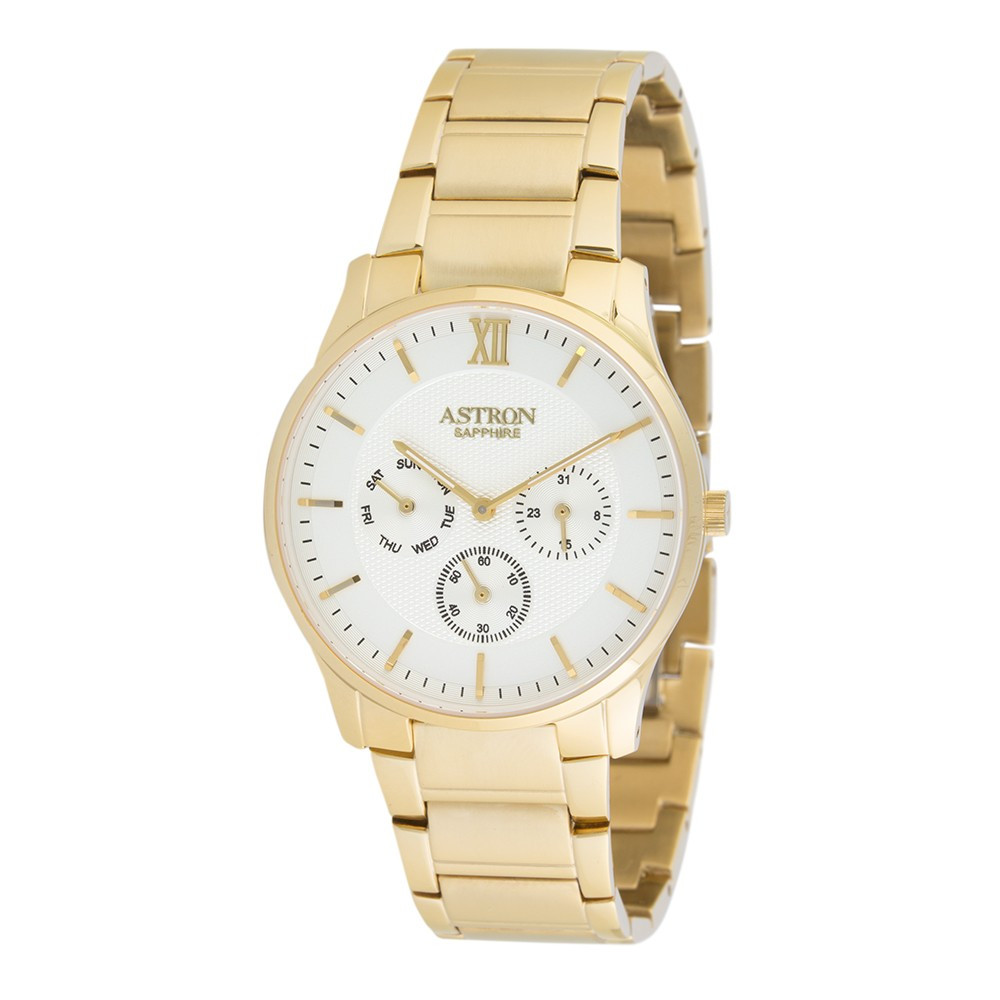 ASTRON 5512-8 elegáns férfi karóra, multifunkciós, arany színű nemesacél tok, arany színű nemesacél csat, fehér számlap, zafírüveg, multifunkciós quartz szerkezet, cseppmentes vízállóság