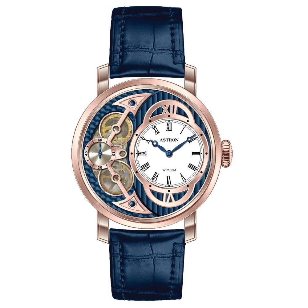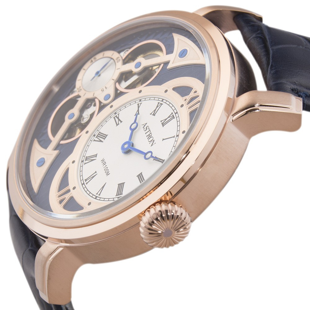 ASTRON 5522-4 férfi karóra, rózsaarany színű nemesacél tok, kék bőrszíj, kék számlap, keményített ásványüveg, (mechanikus+quartz) szerkezet, 100 m (10 ATM) vízállóság