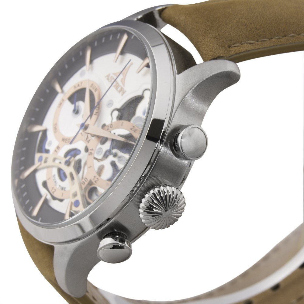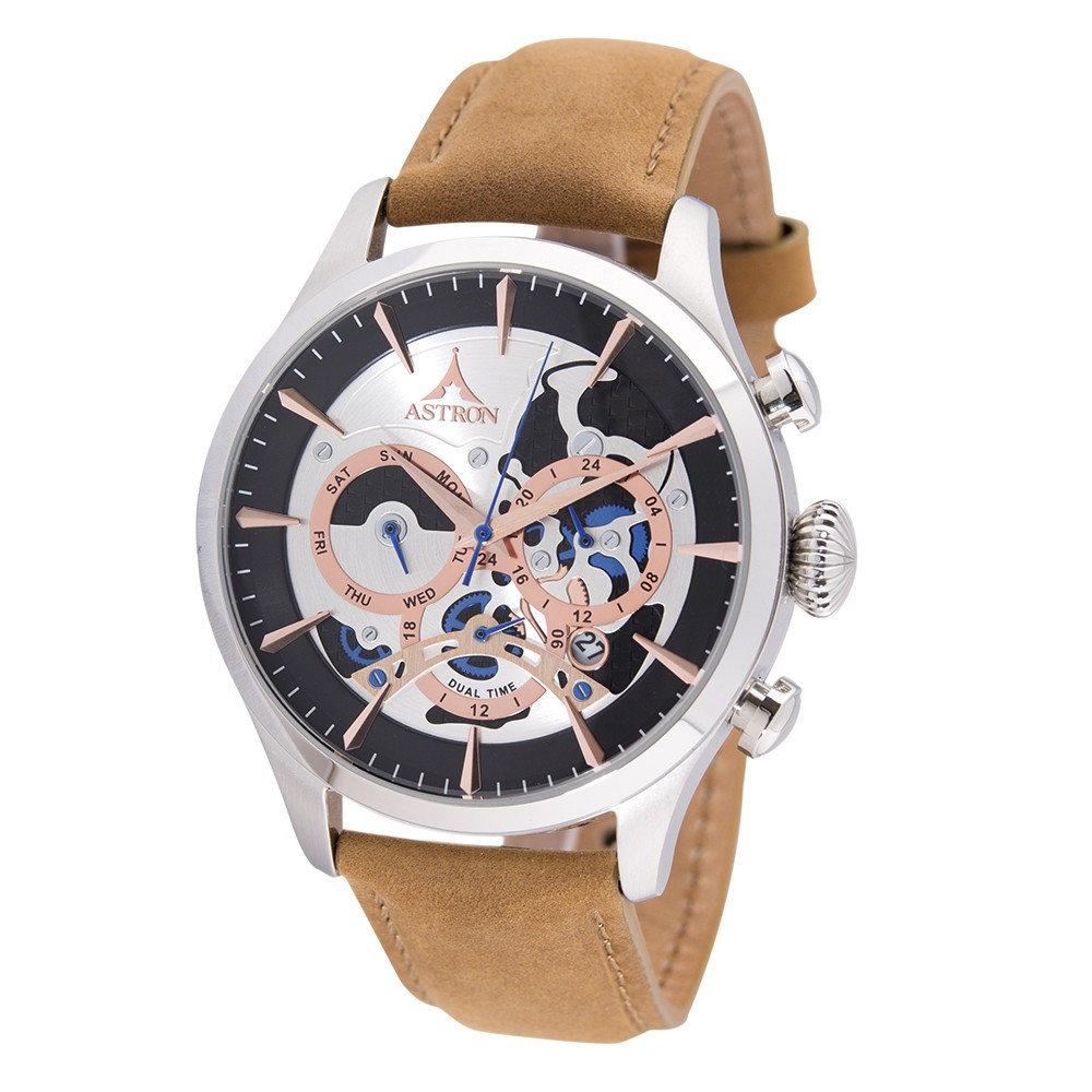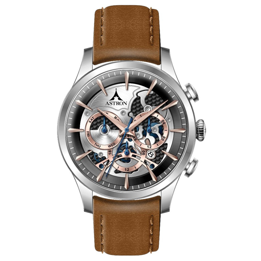 ASTRON 5523-6 férfi karóra, multifunkciós, ezüst színű nemesacél tok, barna bőrszíj, ezüst színű számlap, keményített ásványüveg, quartz szerkezet, 50 m (5 ATM) vízállóság