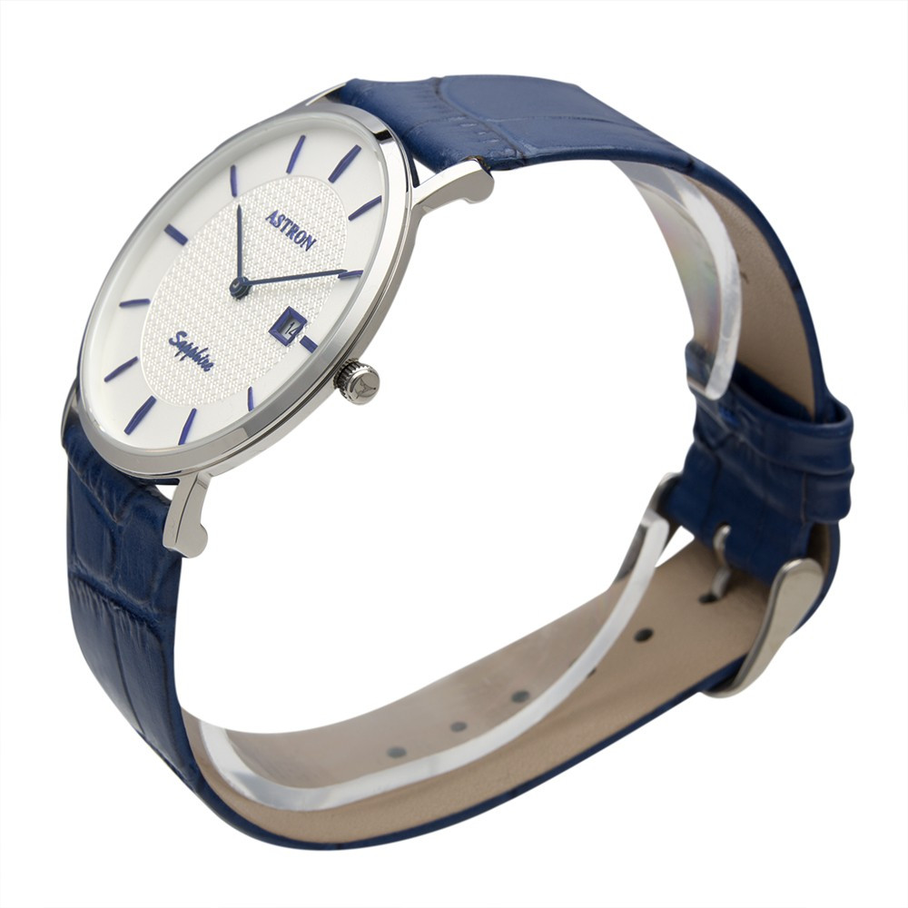ASTRON 5526-2 férfi karóra, ezüst színű nemesacél tok, kék bőrszíj, fehér számlap, zafírüveg, quartz szerkezet, cseppmentes vízállóság