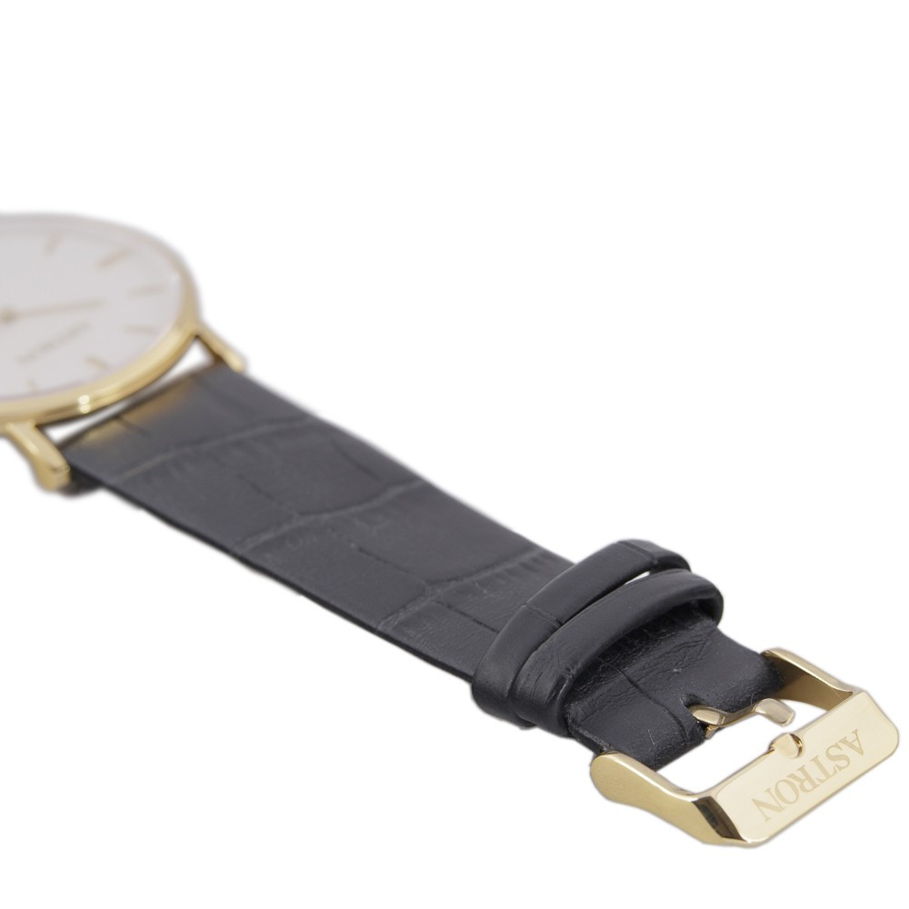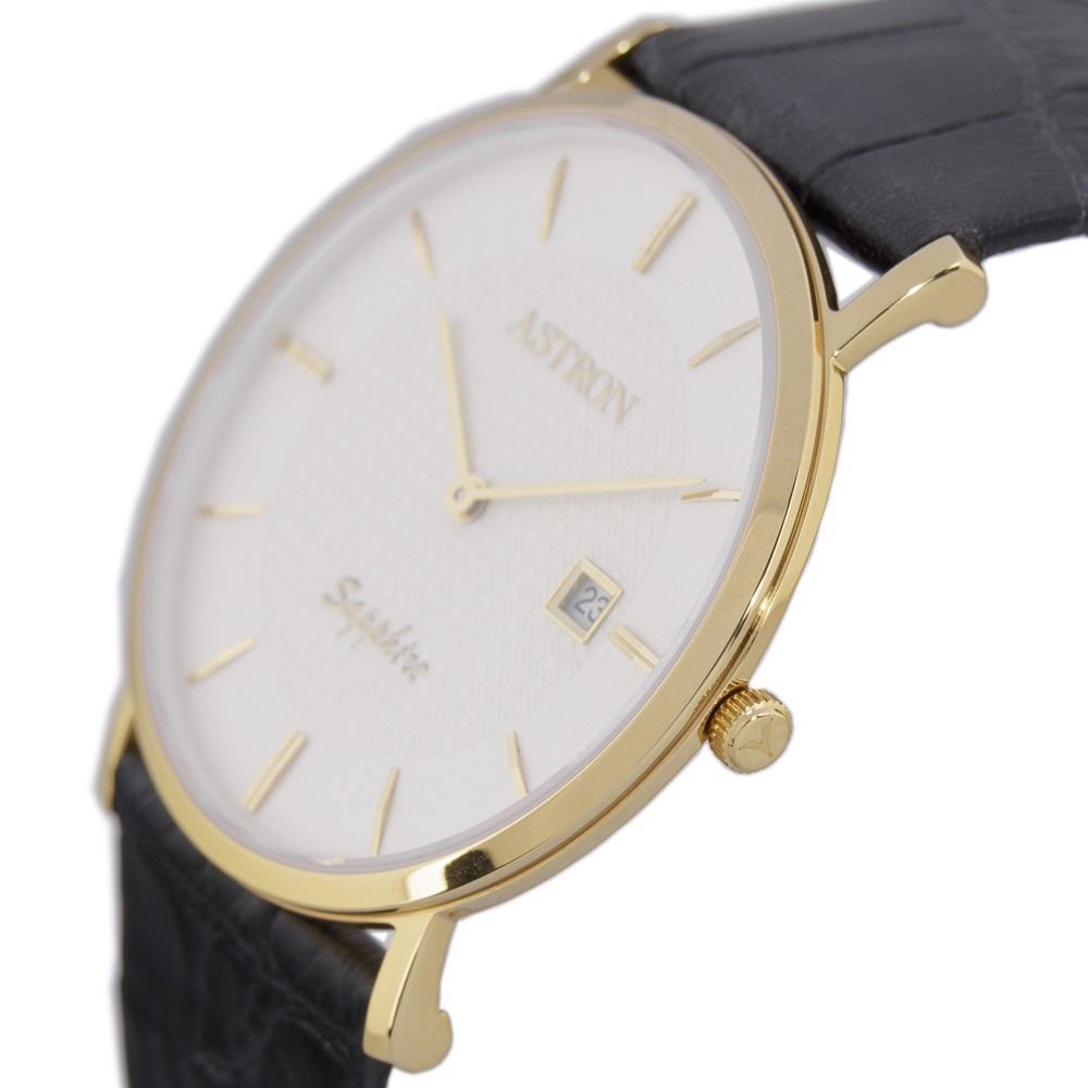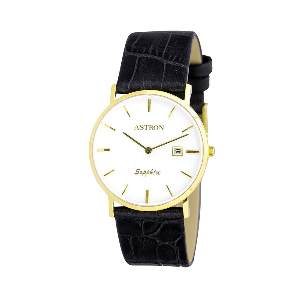 ASTRON 5526-8 férfi karóra, arany színű nemesacél tok, fekete bőrszíj, fehér számlap, zafír, quartz szerkezet, cseppmentes vízállóság