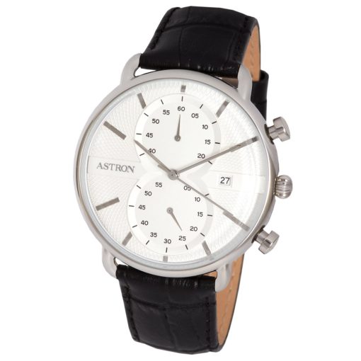 ASTRON 5532-8 férfi karóra, multifunkciós, ezüst színű nemesacél tok, fekete bőrszíj, fehér számlap, keményített ásványüveg, quartz szerkezet, 50 m (5 ATM) vízállóság