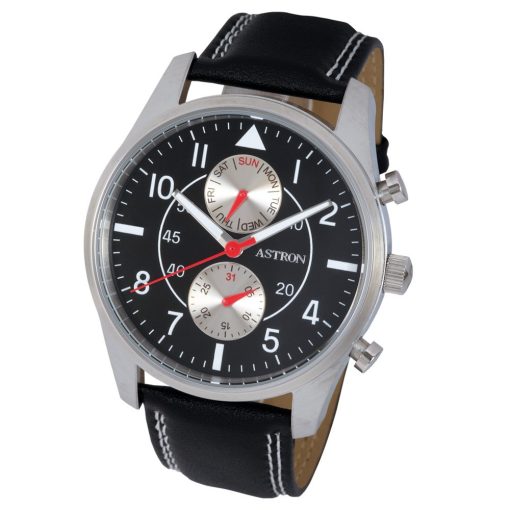 ASTRON 5534-1 férfi karóra, multifunkciós, ezüst színű nemesacél tok, fekete bőrszíj, fekete számlap, keményített ásványüveg, quartz szerkezet, 50 m (5 ATM) vízállóság