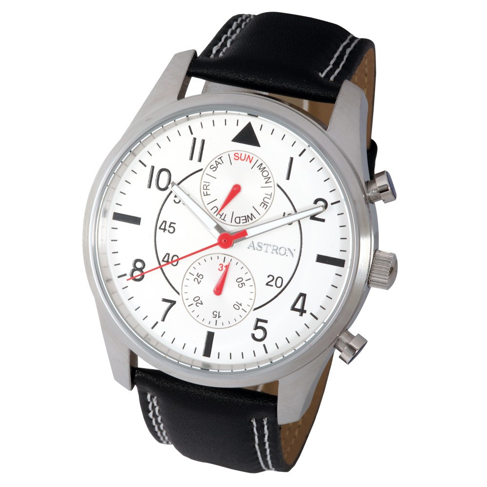 ASTRON 5534-7 férfi karóra, multifunkciós, ezüst színű nemesacél tok, fekete bőrszíj, fehér számlap, keményített ásványüveg, quartz szerkezet, 50 m (5 ATM) vízállóság