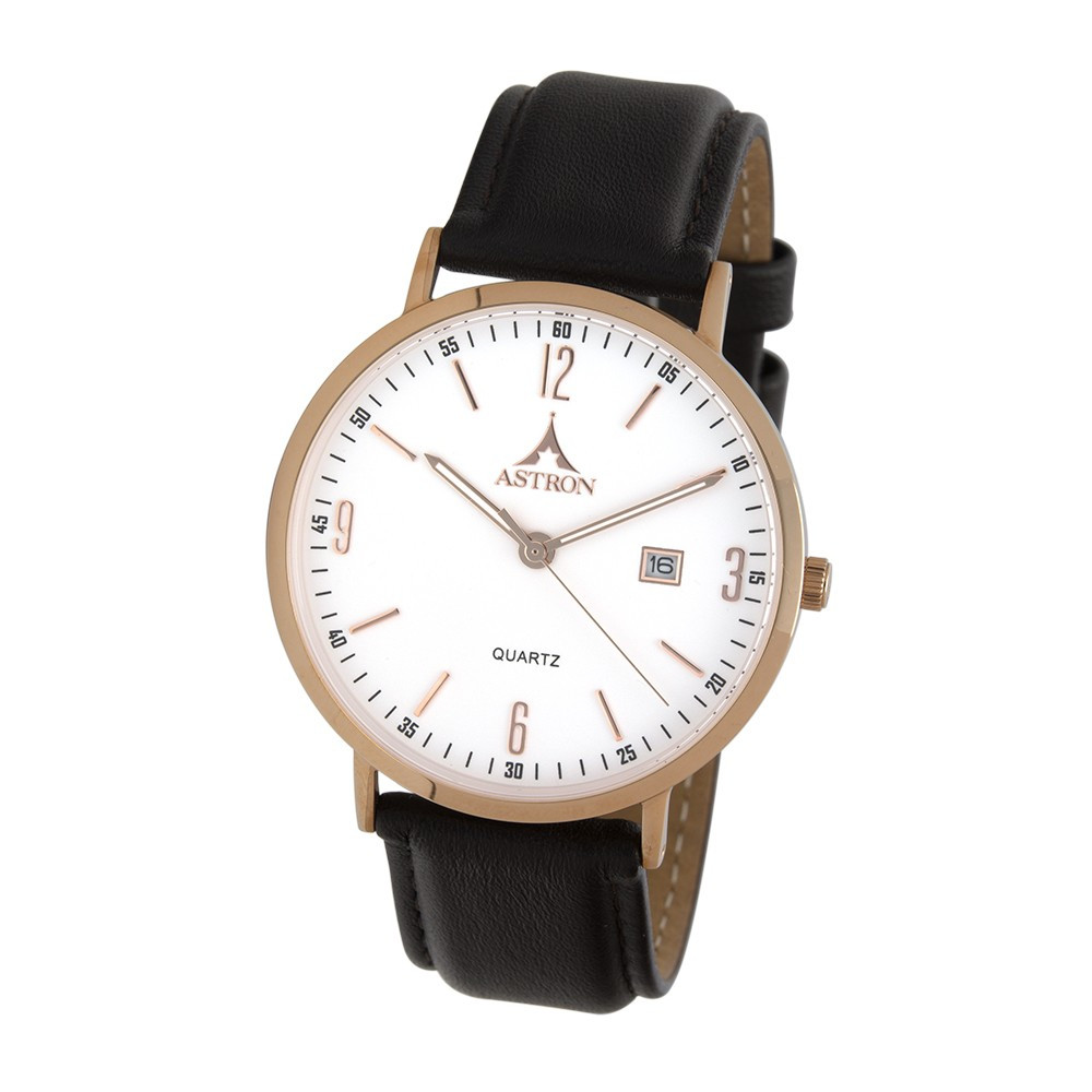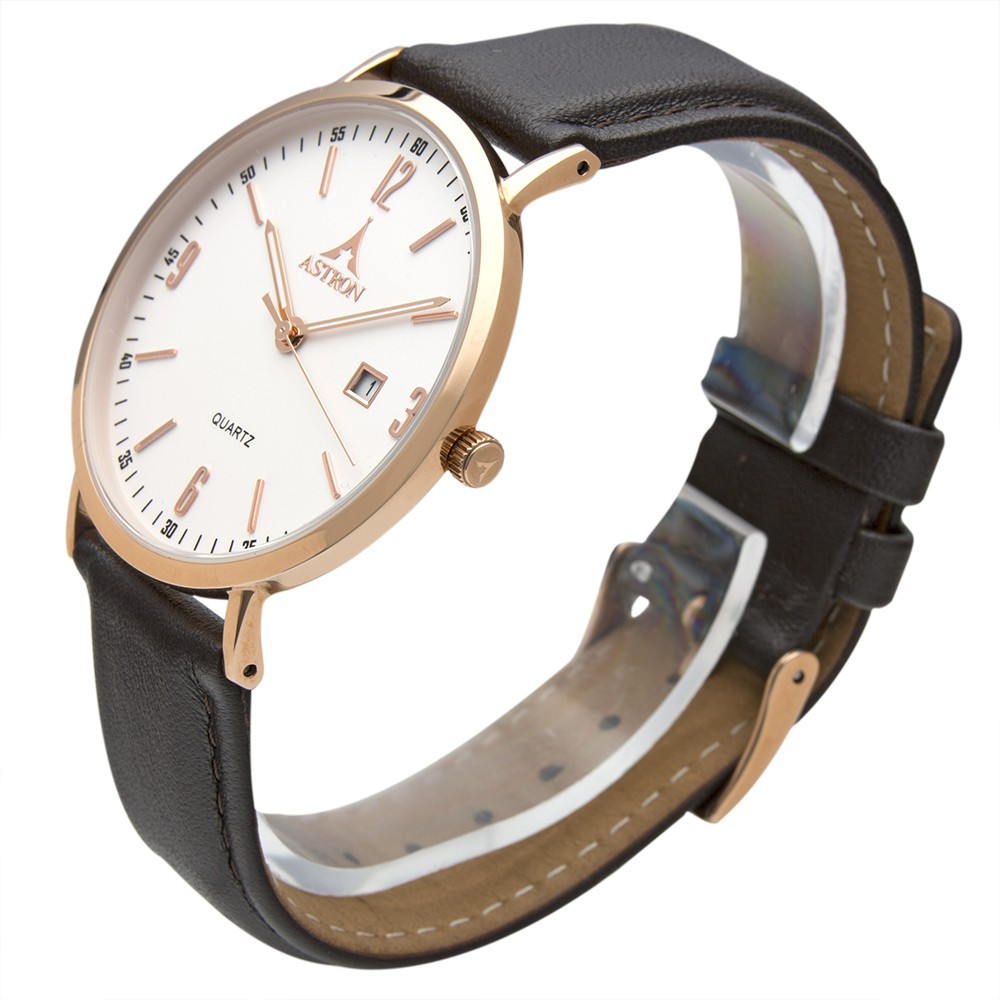 ASTRON 5536-8 férfi karóra, rózsaarany színű nemesacél tok, sötétbarna bőrszíj, fehér számlap, keményített ásványüveg, quartz szerkezet, cseppmentes vízállóság