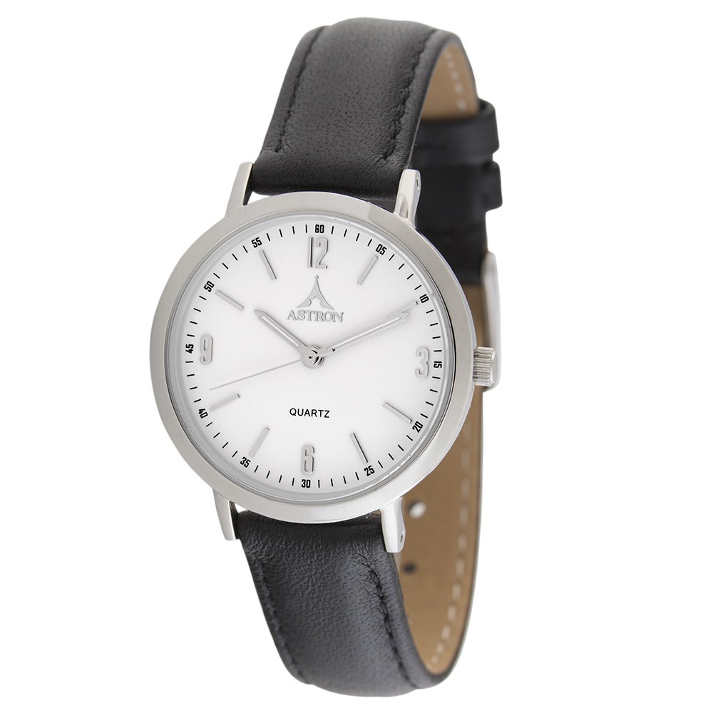 ASTRON 5537-7 női karóra, ezüst színű nemesacél tok, fekete bőrszíj, fehér számlap, keményített ásványüveg, quartz szerkezet, cseppmentes vízállóság