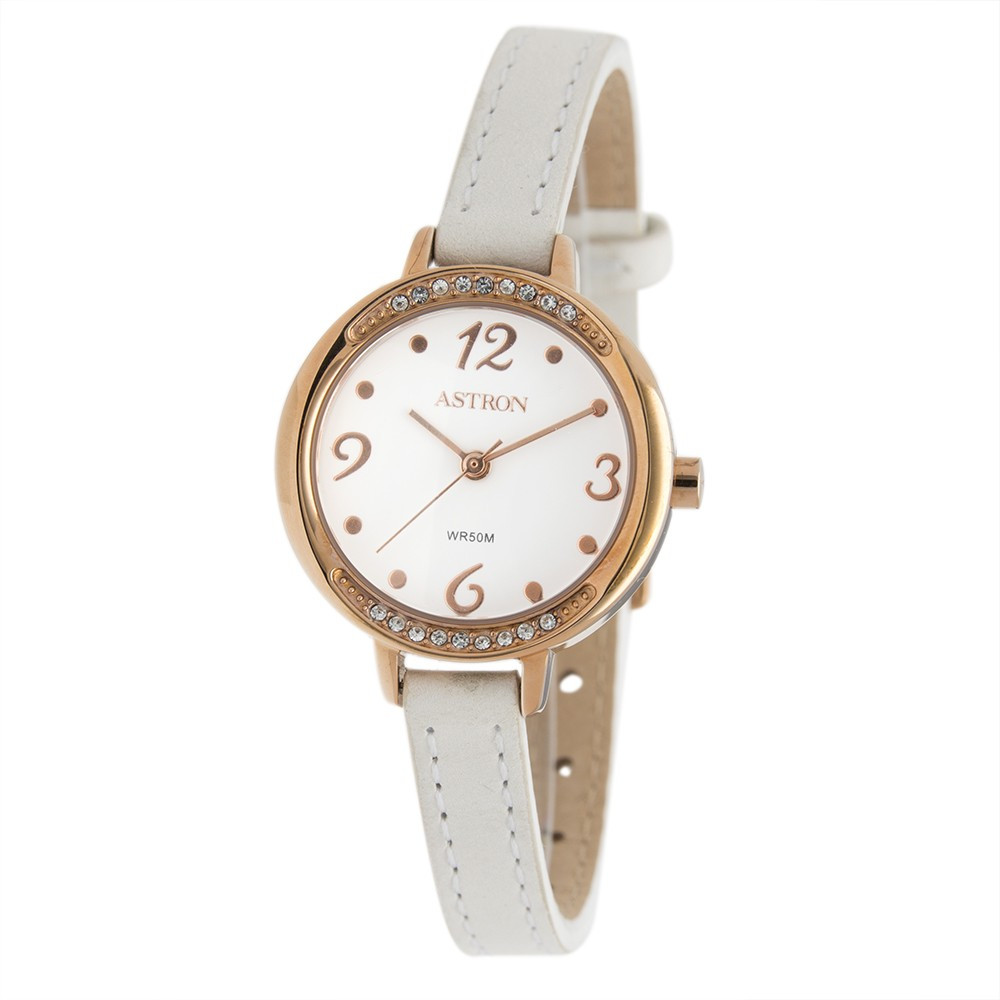ASTRON 5548-0 női karóra, rózsaarany színű nemesacél tok, fehér bőrszíj, fehér számlap, keményített ásványüveg, quartz szerkezet, 50 m (5 ATM) vízállóság