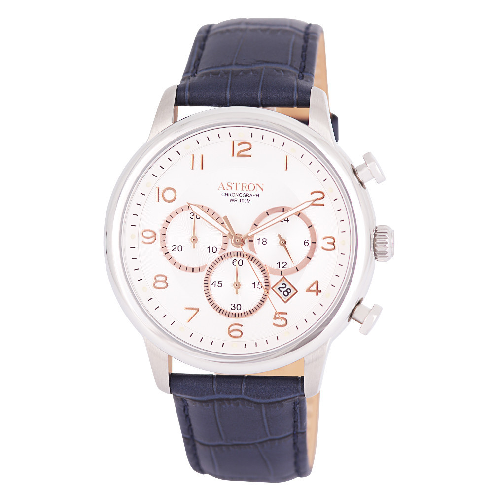 ASTRON 5550-2 elegáns férfi karóra, ezüst színű nemesacél tok, kék bőrszíj, ezüst színű számlap, keményített ásványüveg, chronograph quartz szerkezet, 100 m (10 ATM) vízállóság