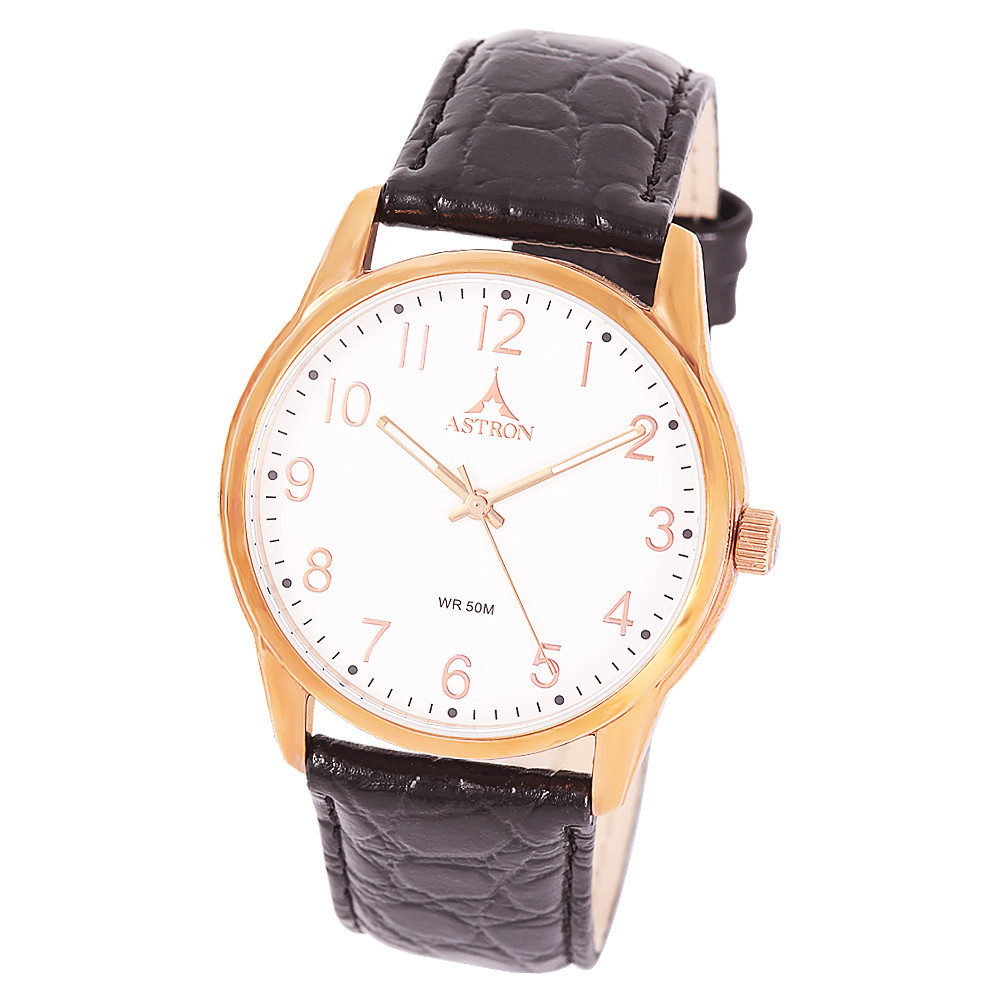 ASTRON 5552-0 férfi karóra, rózsaarany színű nemesacél tok, fekete bőrszíj, fehér számlap, keményített ásványüveg, quartz szerkezet, 50 m (5 ATM) vízállóság