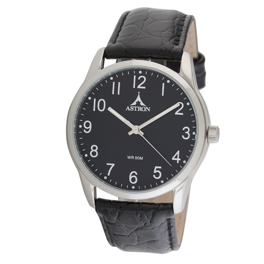 ASTRON 5552-1 férfi karóra, ezüst színű nemesacél tok, fekete bőrszíj, fekete számlap, keményített ásványüveg, quartz szerkezet, 50 m (5 ATM) vízállóság