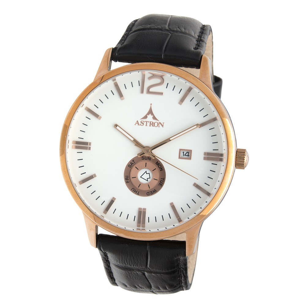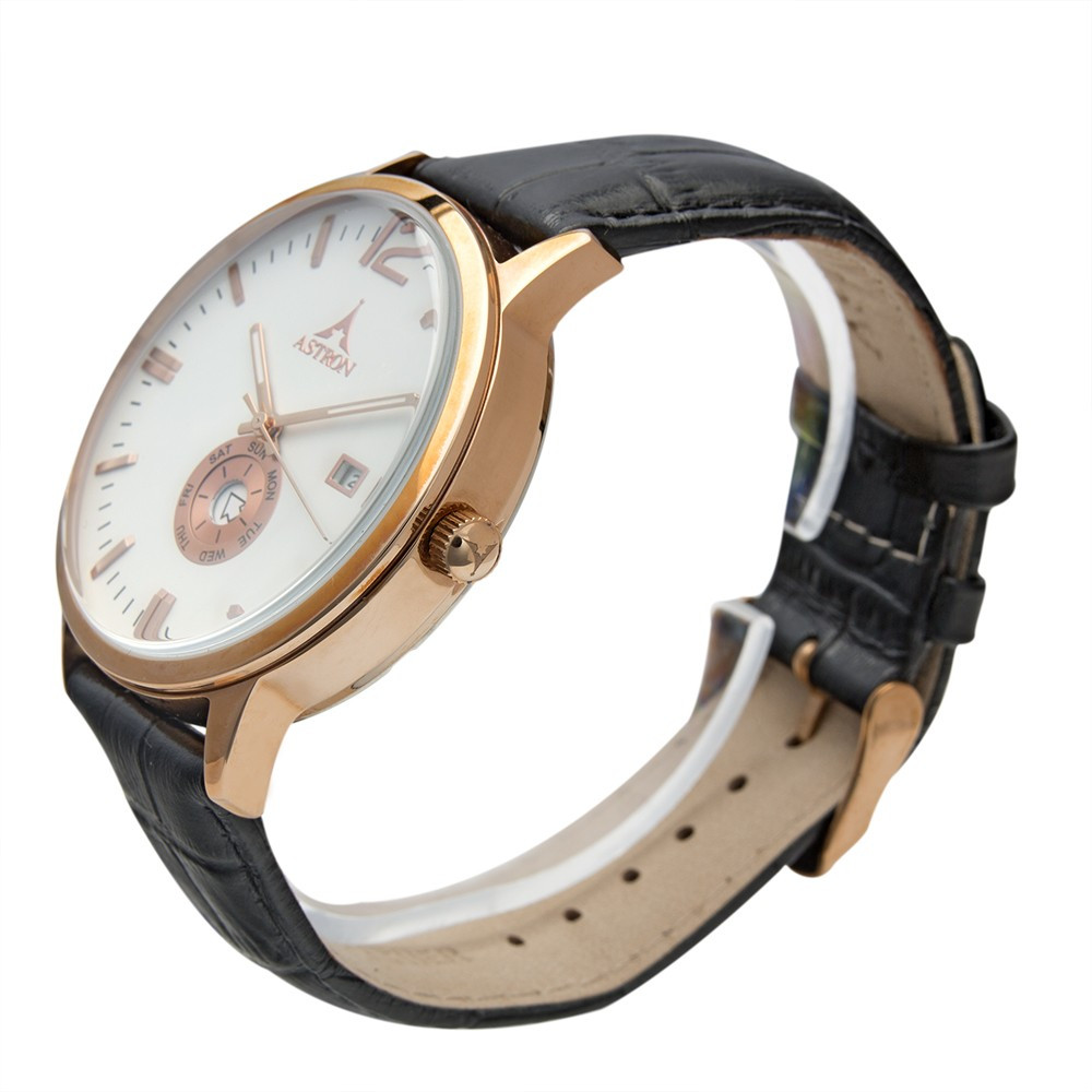 ASTRON 5554-0 férfi karóra, rózsaarany színű nemesacél tok, fekete bőrszíj, fehér számlap, keményített ásványüveg, multifunkciós quartz szerkezet, 50 m (5 ATM) vízállóság