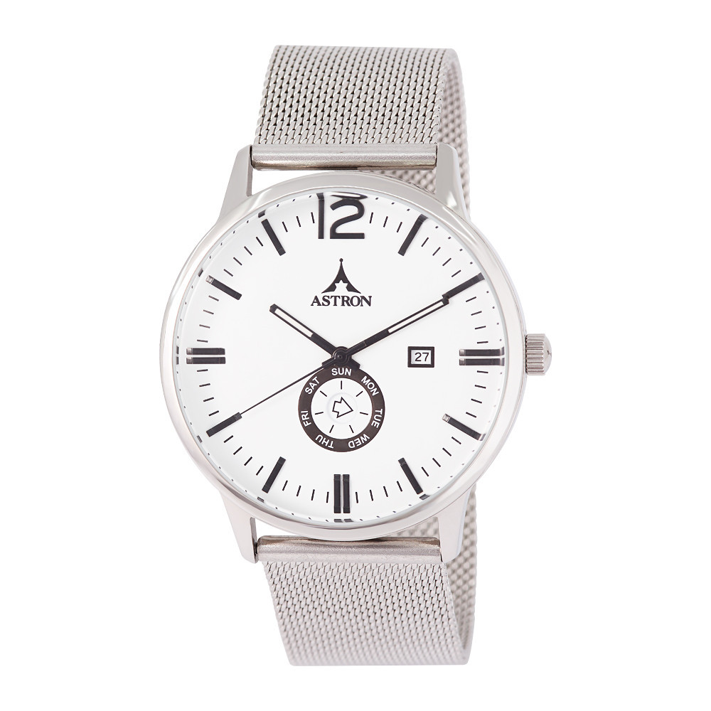 ASTRON 5554-6 elegáns férfi karóra, ezüst színű nemesacél tok, ezüst színű nemesacél csat, fehér számlap, keményített ásványüveg, multifunkciós quartz szerkezet, 50 m (5 ATM) vízállóság
