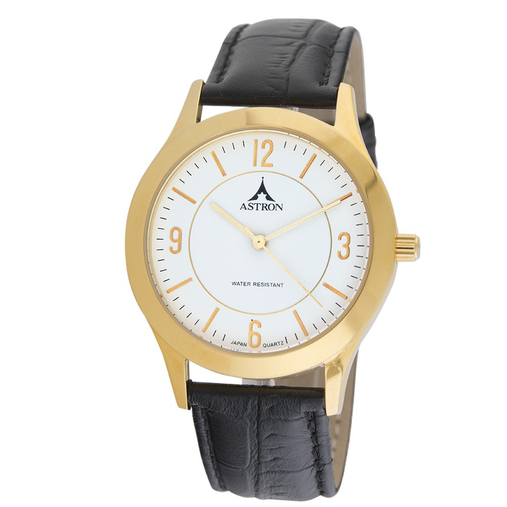 ASTRON 5566-0 férfi karóra, arany színű nemesacél tok, fekete bőrszíj, fehér számlap, keményített ásványüveg, quartz szerkezet, cseppmentes vízállóság