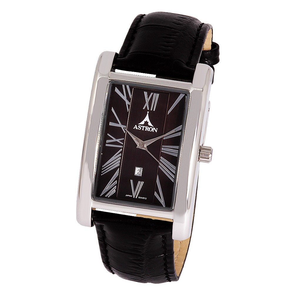 ASTRON 5568-1 férfi karóra, ezüst színű nemesacél tok, fekete bőrszíj, római számos, fekete számlap, keményített ásványüveg, quartz szerkezet, cseppmentes vízállóság
