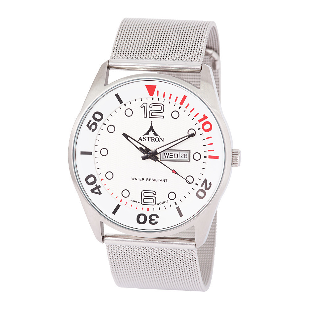 ASTRON 5570-5 férfi karóra, ezüst színű nemesacél tok, ezüst színű karcsat (mesh band), arab számos ezüst számlap, keményített ásványüveg, quartz szerkezet, cseppmentes vízállóság