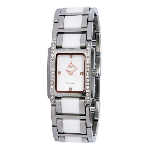 ASTRON 5578-7 női karóra, ezüst színű nemesacél tok, bicolor színű nemesacél csat, kerámia díszítéssel, fehér számlap, keményített ásványüveg, quartz szerkezet, cseppmentes vízállóság