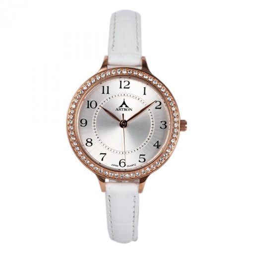 ASTRON 5580-8 női karóra, rózsaarany színű nemesacél tok, fehér bőrszíj, ezüst színű számlap, keményített ásványüveg, quartz szerkezet, 50 m (5 ATM) vízállóság