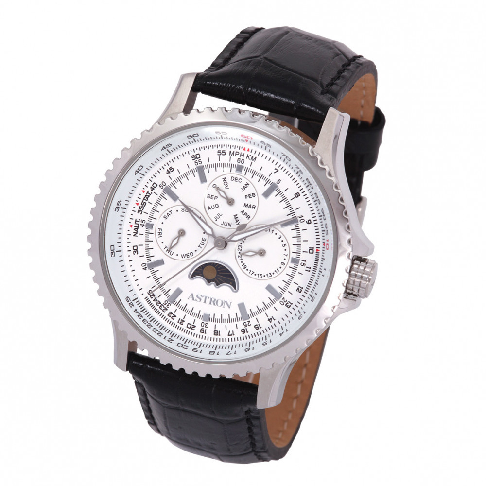 ASTRON 5590-7 férfi karóra, ezüst színű nemesacél tok, fekete bőrszíj, fehér számlap, keményített ásványüveg, quartz szerkezet, 50 m (5 ATM) vízállóság