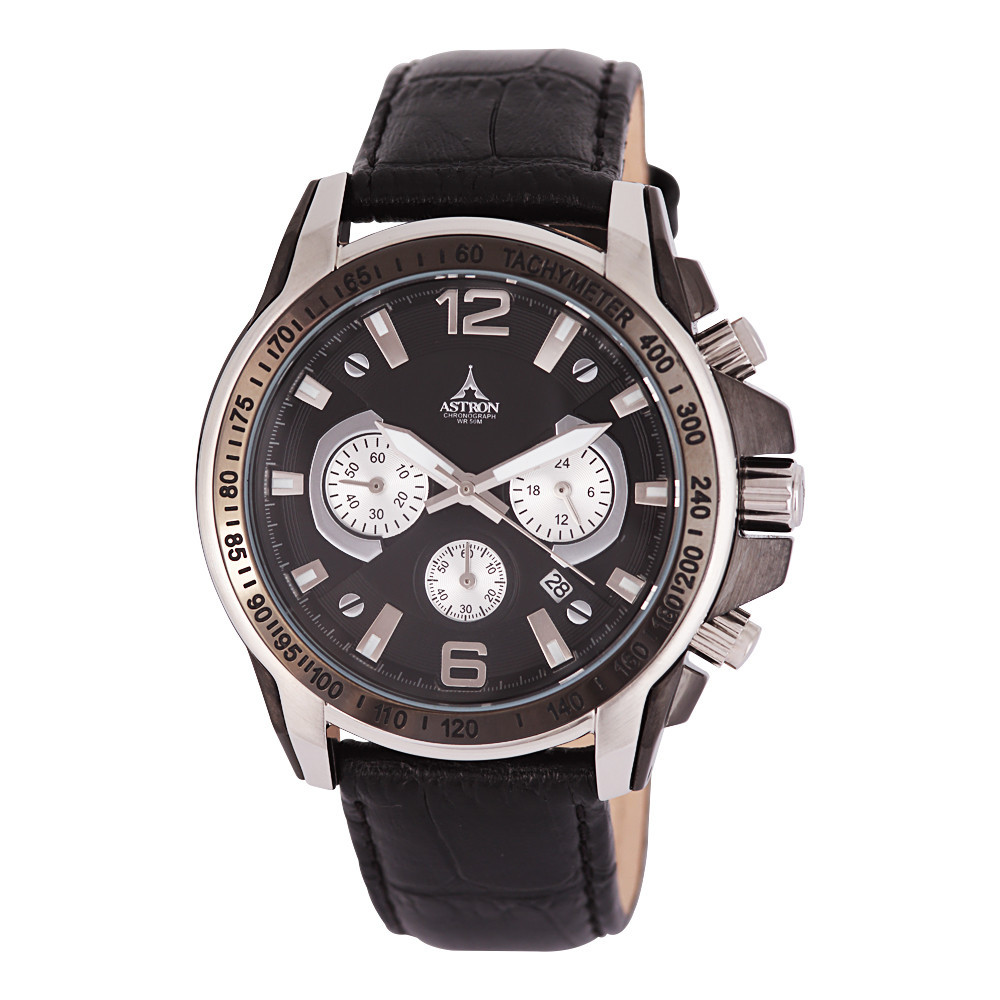 ASTRON 5652-5 sportos férfi karóra, ezüst és fekete színű nemesacél tok, fekete bőrszíj, fekete számlap, keményített ásványüveg, chronograph quartz szerkezet, 50 m (5 ATM) vízállóság