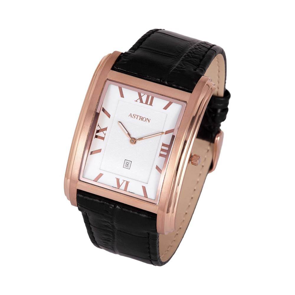 ASTRON 5654-7 férfi karóra, rózsaarany színű nemesacél tok, fekete bőrszíj, fehér számlap, keményített ásványüveg, quartz szerkezet, cseppmentes vízállóság