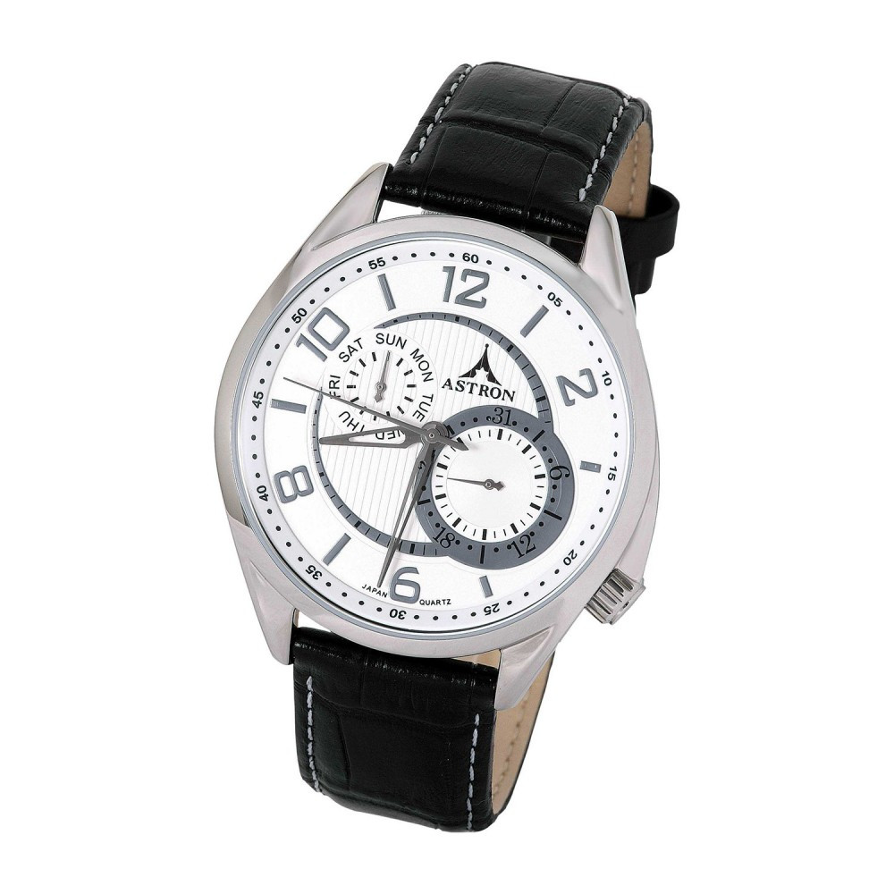 ASTRON 5670-7 férfi karóra, ezüst színű nemesacél tok, fekete bőrszíj, fehér számlap, keményített ásványüveg, quartz szerkezet, 50 m (5 ATM) vízállóság