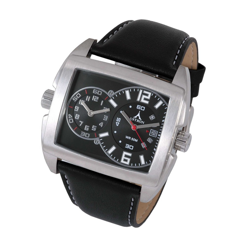 ASTRON 5673-1 férfi karóra, multifunkciós, ezüst színű nemesacél tok, fekete bőrszíj, fekete számlap, keményített ásványüveg, quartz szerkezet, 50 m (5 ATM) vízállóság