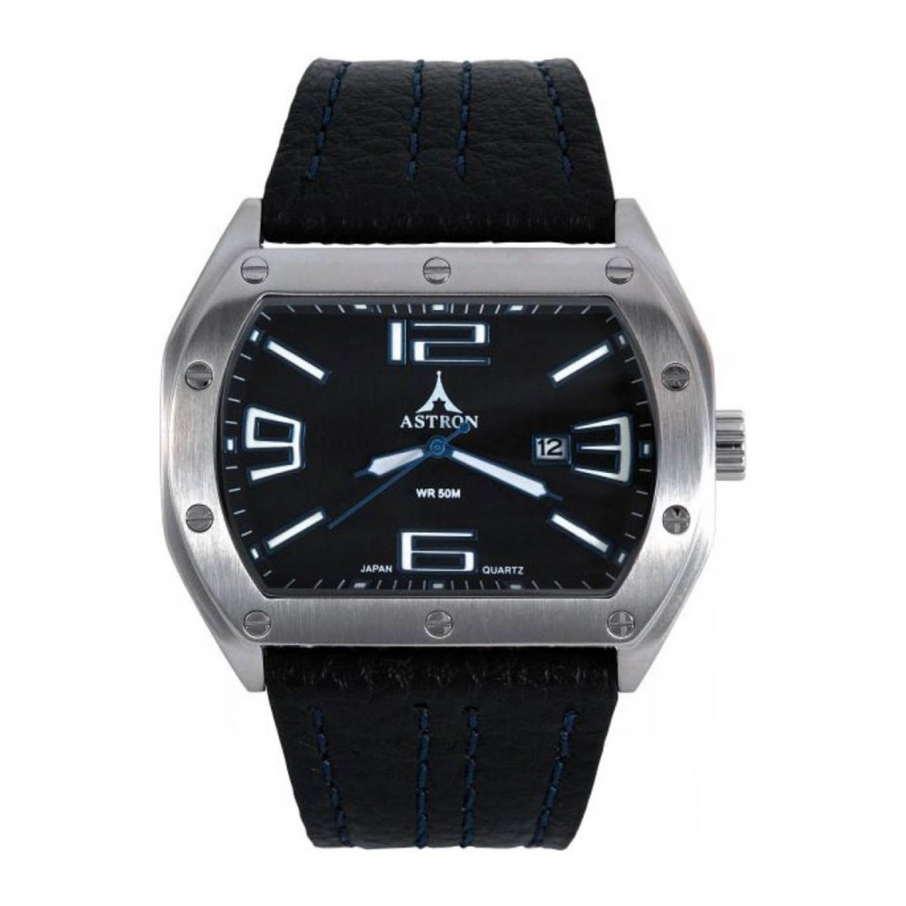 ASTRON 5698-1 férfi karóra, ezüst színű nemesacél tok, fekete bőrszíj, fekete számlap, keményített ásványüveg, quartz szerkezet, 50 m (5 ATM) vízállóság