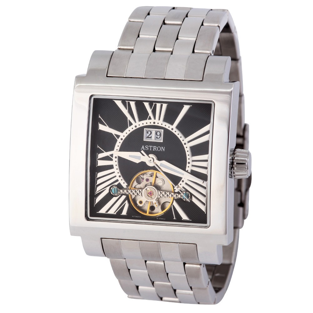 ASTRON 5754-1, mechanikus-automata szerkezet, férfi karóra, ezüst színű nemesacél tok, ezüst színű nemesacél csat, fekete számlap, keményített ásványüveg, cseppmentes vízállóság