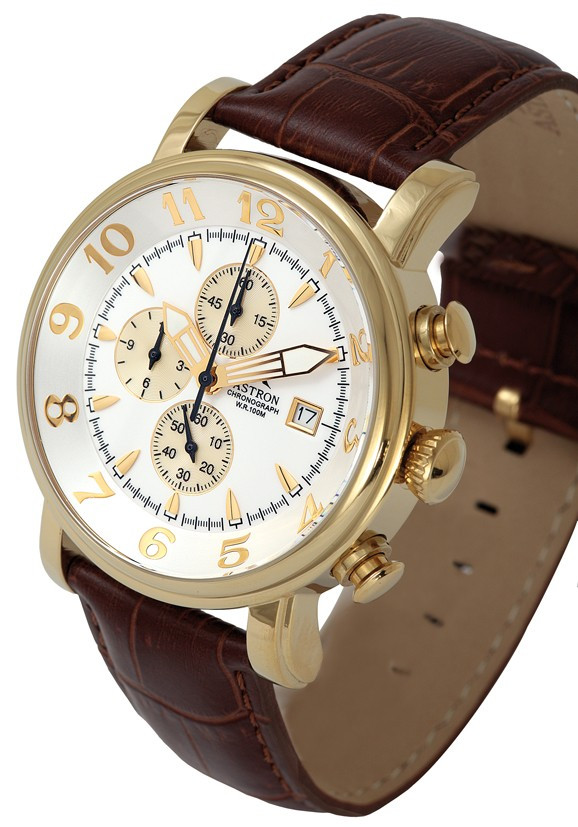 ASTRON 5757-7 férfi karóra, arany színű nemesacél tok, barna bőrszíj, fehér számlap, keményített ásványüveg, quartz szerkezet, 100 m (10 ATM) vízállóság