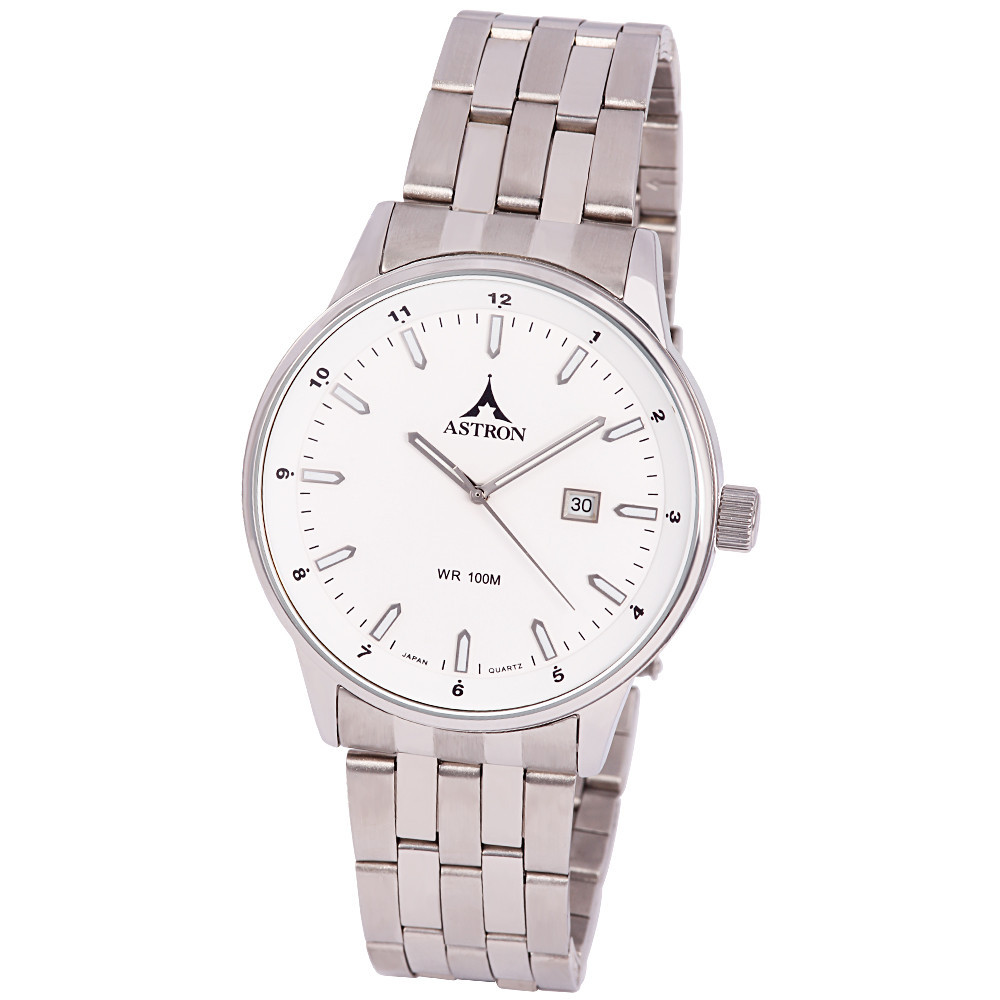 ASTRON 5765-7 elegáns férfi karóra, ezüst színű nemesacél tok, ezüst színű nemesacél csat, fehér számlap, keményített ásványüveg, quartz szerkezet, 100 m (10 ATM) vízállóság