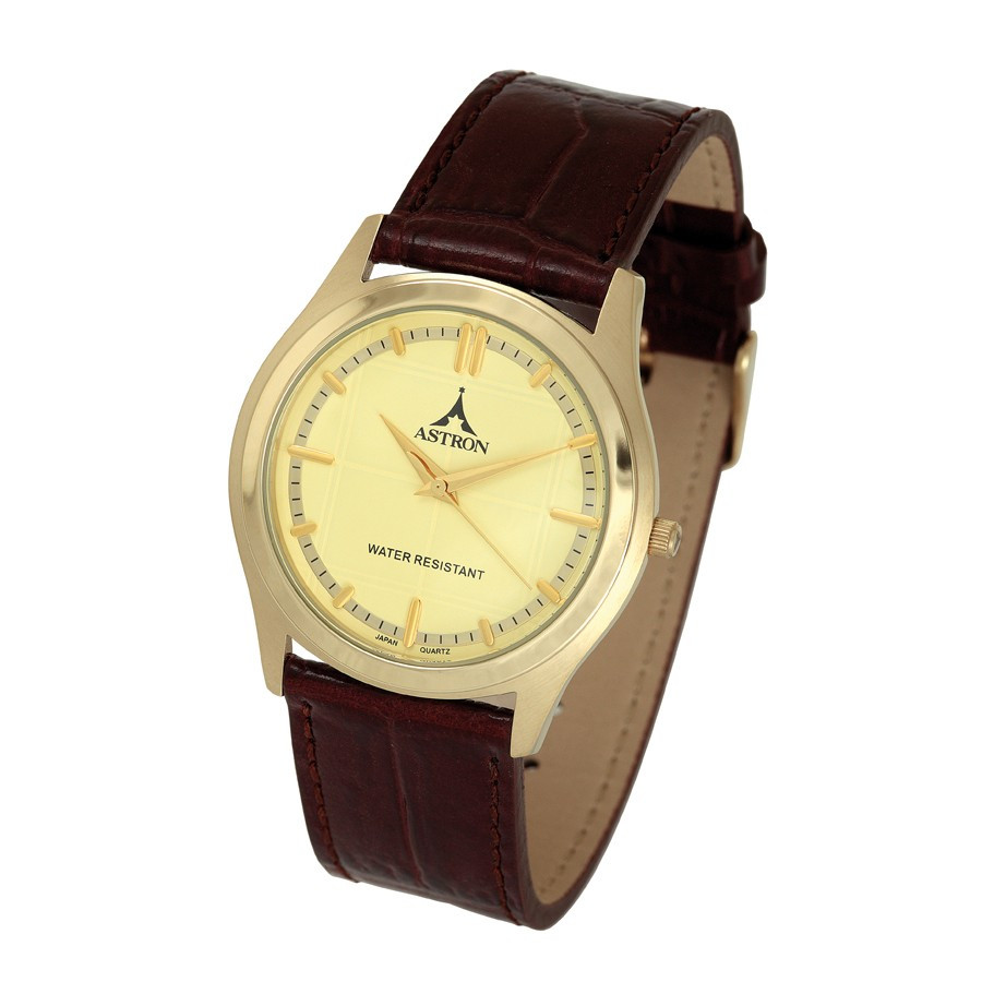 ASTRON 5766-9 férfi karóra, arany színű nemesacél tok, barna bőrszíj, pezsgőszínű számlap, keményített ásványüveg, quartz szerkezet, cseppmentes vízállóság