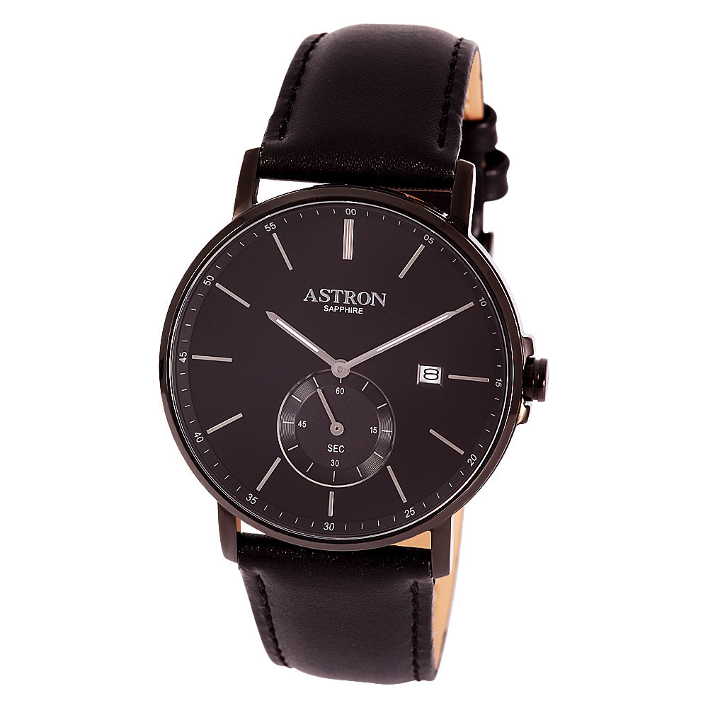 ASTRON 8002-1 elegáns férfi karóra, fekete színű nemesacél tok, fekete bőrszíj, fekete számlap, zafírüveg, quartz szerkezet, cseppmentes vízállóság