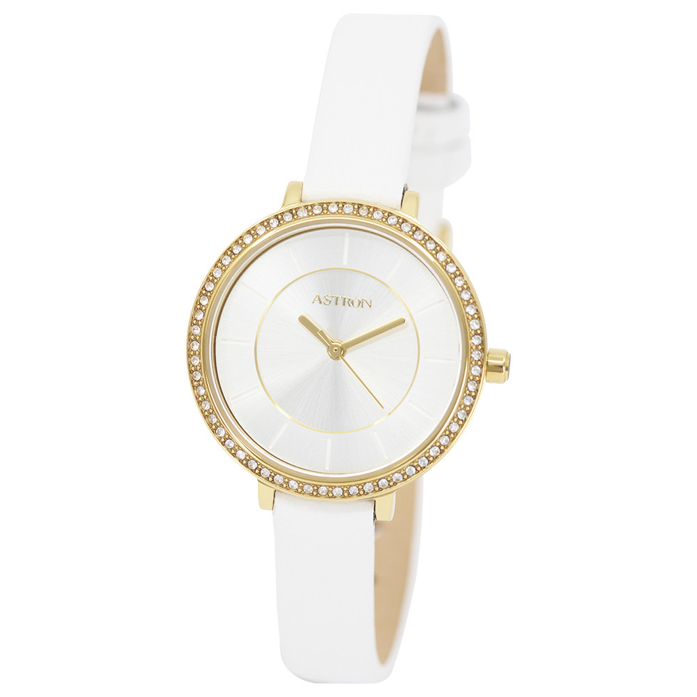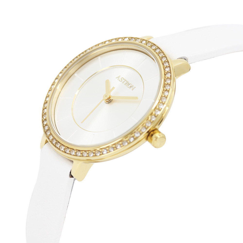 ASTRON 8008-0 divatos női karóra, arany színű nemesacél tok, fehér bőrszíj, ezüst színű számlap, keményített ásványüveg, quartz szerkezet, cseppmentes vízállóság