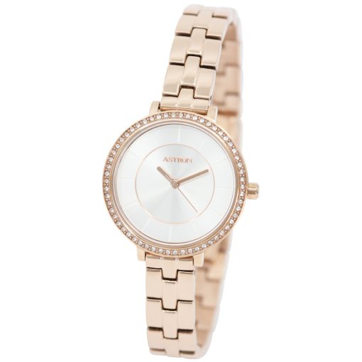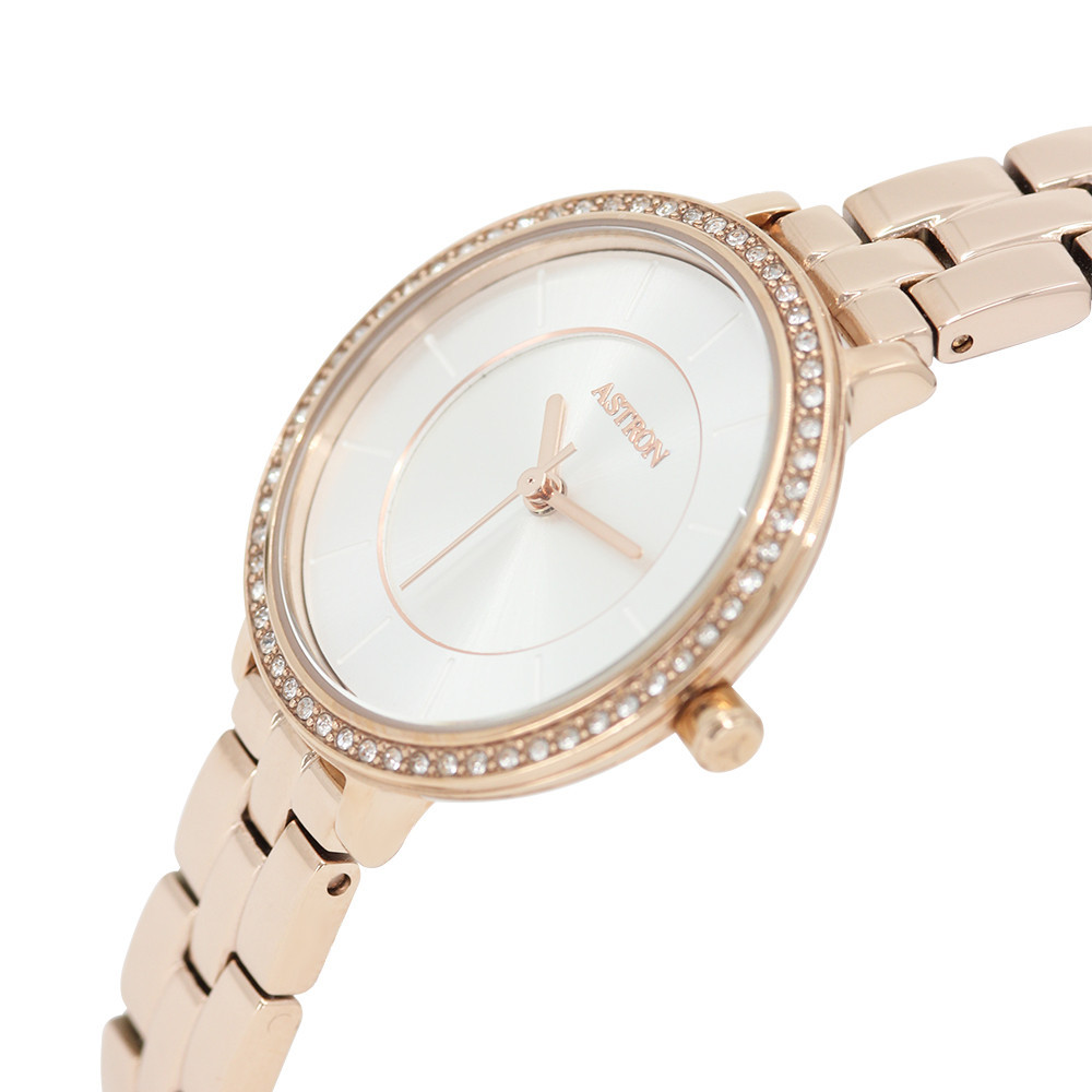 ASTRON 8009-8 divatos női karóra, rózsaarany színű nemesacél tok, rózsaarany színű nemesacél csat, ezüst színű számlap, keményített ásványüveg, quartz szerkezet, cseppmentes vízállóság