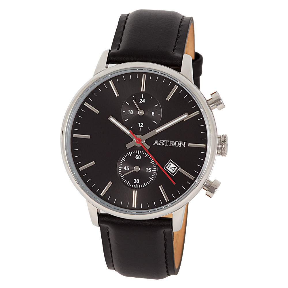 ASTRON 8012-5 sportos férfi karóra, ezüst színű nemesacél tok, fekete bőrszíj, fekete számlap, keményített ásványüveg, multifunkciós quartz szerkezet, 50 m (5 ATM) vízállóság