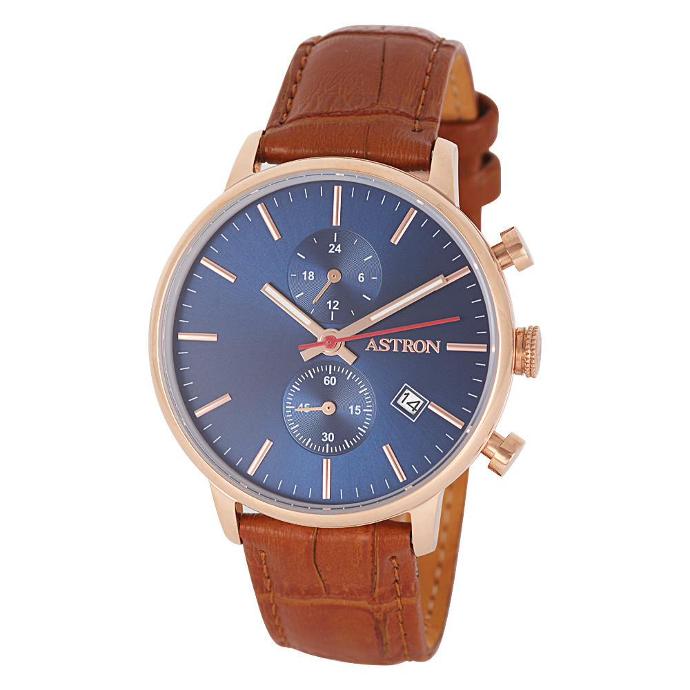 ASTRON 8012-6 sportos férfi karóra, rózsaarany színű nemesacél tok, barna bőrszíj, kék számlap, keményített ásványüveg, multifunkciós quartz szerkezet, 50 m (5 ATM) vízállóság