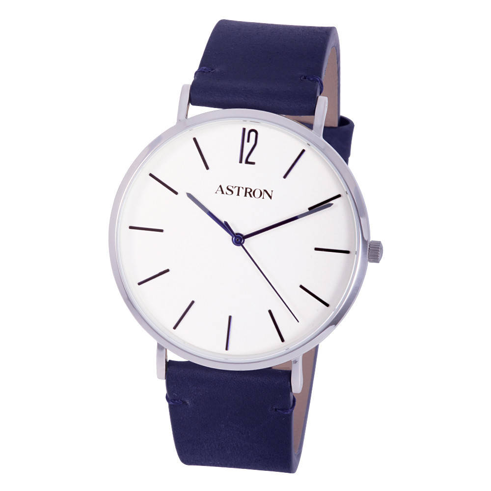 ASTRON 8014-7 elegáns férfi karóra, ezüst színű nemesacél tok, kék bőrszíj, fehér számlap, keményített ásványüveg, quartz szerkezet, cseppmentes vízállóság