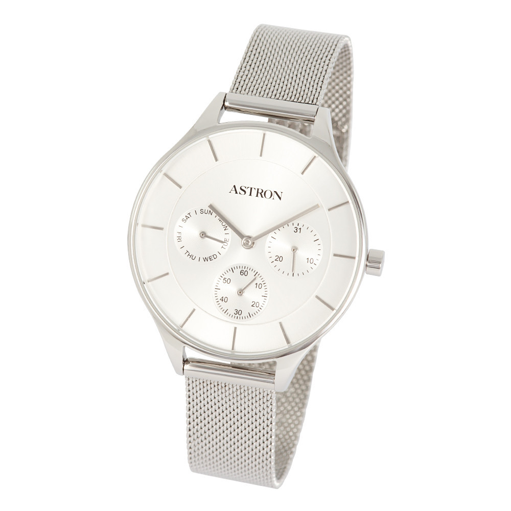 ASTRON 8015-8 elegáns női karóra, ezüst színű nemesacél tok, ezüst színű nemesacél csat, ezüst színű számlap, keményített ásványüveg, multifunkciós quartz szerkezet, cseppmentes vízállóság